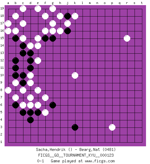 Last move : 0-1 2011 August 30 10:8:13 [Event "FICGS__GO__TOURNAMENT_KYU__000123"] [Site "FICGS"] [Date "2011.06.08"] [Round "1"] [Black "Sacha,Hendrik"] [White "Bearg,Nat"] [Result "0-1"] [Rating 2 "0481"] 1.d4 r15 2.d16 p3 3.k3 g17 4.h17 c6 5.c5 c12 6.c7 d6 7.b6 d7 8.d8 e8 9.e7 e6 10.d5 f7 11.e5 f5 12.c9 d9 13.b8 c8 14.g6 b7 15.g18 g16 16.g15 h16 17.j18 j17 18.j16 h18 19.f17 f18 20.e18 g19 21.d17 k18 22.e16 f16 23.e17 c15 24.c16 b16 25.b17 a16 26.d15 a17 27.b15 b18 28.c18 c17 29.c14 c19 30.d18 e15 31.f15 e14 32.d13 d14 33.d12 e12 34.d11 c11 35.c10 d10 36.c13 b9 37.b10 a8 38.b12 e19 39.d19 c15 40.b11 k10 0-1 This go game has been lost on time (started : 2011.06.08 7:28:27) Here are the names of the openings (joseki) played in the four corners : Corner d16 : d16 g17 Hoshi (Hwajeom, Seongjeom, Xingwei`) 4-4 Point. The star or hoshi (4-4) point, emphasizing influence at the potential expense of territory. Niken Kakari (Dukan Keolch'im, E`r Gua`jiao~, 2-Space Low Approach). Black typically answers by 7-3 or 3-5 (which is not joseki). Corner d4 : d4 c6 Hoshi (Hwajeom, Seongjeom, Xingwei`) 4-4 Point. The star or hoshi (4-4) point, emphasizing influence at the potential expense of territory. Ikken Kakari (Hankan Keolch'im, Yi Gua`jiao~, 1-Space Low Approach). White 2 is the standard approach move to the 4-4. Player White won this Go (weiqi, baduk) game. Follow this game move after move (download)Go is to western chess what philosophy is to double entry accounting. (from Shibumi, by Trevanian) Methinks King Thibault should dub Marius Zubac a knight of the square board... I mean table, henceforth addressing him as Sir Marius, and bestow on him a suitable land from the kingdom of FICGS & marry him off to a worthy, fair maiden, lest he slice our heads with his mighty sword in his wrath. (Dinesh De Silva)