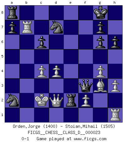 Last move : 0-1 2007 January 25 12:58:29 [Event "FICGS__CHESS__CLASS_D__000023"] [Site "FICGS"] [Date "2006.12.24"] [Round "1"] [White "Orden,Jorge"] [Black "Stoian,Mihail"] [Result "0-1"] [WhiteElo "1400"] [BlackElo "1505"] 1.e4 e6 2.d4 d5 3.exd5 exd5 4.c4 Nf6 5.Bg5 Bb4+ 6.Nc3 O-O 7.Qc2 dxc4 8.Nf3 Re8+ 9.Be2 h6 10.Bh4 Bg4 11.O-O-O c6 12.h3 Bh5 13.Bxc4 Nbd7 14.g4 Bg6 15.Bd3 Qa5 16.Bxg6 fxg6 17.Bg3 Bxc3 18.bxc3 Nd5 19.c4 Nb4 20.Qd2 Nxa2+ 21.Kc2 Qa3 22.Rb1 Qxf3 23.Rxb7 Re2 0-1 French : Exchange variation Kingside Castling by player Black (move 6) Queenside Castling by player White (move 11) Player Black won this chess game. Follow this game move after move (download)Help your pieces so they can help you. (Paul Morphy) Viele Opfer benötigen überhaupt keine konkrete Berechnung. Es genügt sich die entstehende Position kurz vorzustellen, um uns davon zu überzeugen, dass das Opfer korrekt ist. (Mikhail Nekhemyevich Tal) Mi estilo es algo parecido entre un poco de Tal y Petrosian. (Reshevsky) Le plus grand jeu de l'esprit jamais inventé, plus vous l'apprenez, plus vous y prenez du plaisir. (Garry Kasparov) If you are good, you will be assigned all the work. If you are really good, you will get out of it. (Dan Rotaru)
