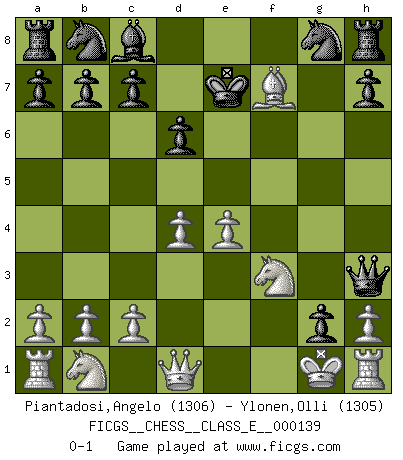 Last move : 0-1 2011 July 21 14:58:3 [Event "FICGS__CHESS__CLASS_E__000139"] [Site "FICGS"] [Date "2011.06.10"] [Round "1"] [White "Piantadosi,Angelo"] [Black "Ylonen,Olli"] [Result "0-1"] [WhiteElo "1306"] [BlackElo "1305"] 1.e4 e5 2.f4 exf4 3.Bc4 Qh4+ 4.Kf1 d6 5.Nf3 Qh5 6.d4 g5 7.g3 fxg3 8.Kg2 Qh3+ 9.Kg1 g2 10.Bxf7+ Kd8 11.Bxg5+ Be7 12.Bxe7+ Kxe7 0-1 KGA : Bishop's gambit Player Black won this chess game. Follow this game move after move (download)Every Chess master was once a beginner. (Chernev) Sie bekommen vielleicht den Eindruck, dass die Spitzenspieler überhaupt gar nicht so stark sind. Aber das stimmt nicht. Es ist eine Illusion. Mit einem Computer an der Seite ist es sehr leicht, Urteile zu fällen, aber wenn man alleine am Brett sitzt, sieht die Sache ganz anders aus. (Vladimir Kramnik) El Ajedrez es el gimnasio de la mente. (Blaise Pascal) La conception d'un plan est le processus par lequel un joueur exploite les avantages de sa position tout en s'efforçant d'en réduire au minimum les inconvénients. Afin de garantir le succès, un plan doit toujours se fonder sur un diagnostic objectif des particularités d'une position. La conception d'un plan est d'autant plus difficile que la position est équilibrée, et grandement facilitée lorsqu'il n'existe qu'un seul plan susceptible de répondre aux exigences de la position. (Harry Golombek) There are two major products that came out of Berkeley: LSD and UNIX. We do not believe this is to be a coincidence. (Jeremy S. Anderson)