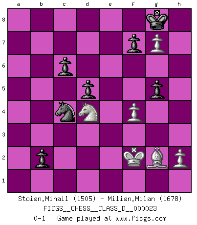 Last move : 0-1 2007 March 9 7:44:24 [Event "FICGS__CHESS__CLASS_D__000023"] [Site "FICGS"] [Date "2006.12.24"] [Round "1"] [White "Stoian,Mihail"] [Black "Milian,Milan"] [Result "0-1"] [WhiteElo "1505"] [BlackElo "1678"] 1.Nf3 d5 2.d4 Bf5 3.c4 e6 4.Nc3 c6 5.g3 Nf6 6.cxd5 exd5 7.Bg5 Be7 8.Bg2 h6 9.Bxf6 Bxf6 10.O-O O-O 11.e3 Nd7 12.Rc1 Re8 13.Qb3 Qb6 14.Nd2 Qxb3 15.Nxb3 a5 16.Nd2 Nb6 17.b3 Be7 18.Ncb1 a4 19.e4 axb3 20.exf5 bxa2 21.Nc3 Bb4 22.Nb3 Ra3 23.Nxa2 Rxb3 24.Rb1 Rxb1 25.Rxb1 Re1+ 26.Rxe1 Bxe1 27.Nc1 Bc3 28.Ne2 Bb2 29.f4 Nc4 30.Kf2 b5 31.g4 b4 32.g5 b3 33.f6 Bxd4+ 34.Nxd4 b2 35.fxg7 hxg5 0-1 Reti Opening Kingside Castling by player White (move 10) Kingside Castling by player Black (move 10) Player Black won this chess game. Follow this game move after move (download)Play the opening like a book, the middle game like a magician, and the endgame like a machine. (Spielmann) Moralische Siege zählen nicht. (Savielly Grigorievitsch Tartakower) El hombre es un frívolo, una creatura engañosa y como un jugador de Ajedrez, se preocupa mas por el proceso de obtener su meta que de la meta por sí misma. (Dostoyevsky) Nous vivons dans un monde échiquéen : chaque jour qui passe est un défi à relever. (Philosophe Sasha) I teach you to lie, cheat and steal, and as soon as my back's turned you wait in line ? (Gregory House, House M.D.)