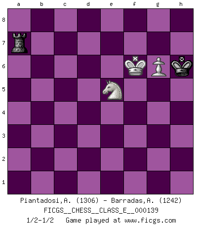 Last move : 1/2-1/2 2011 August 5 0:54:19 [Event "FICGS__CHESS__CLASS_E__000139"] [Site "FICGS"] [Date "2011.06.10"] [Round "1"] [White "Piantadosi,Angelo"] [Black "Barradas,Anderson"] [Result "1/2-1/2"] [WhiteElo "1306"] [BlackElo "1242"] 1.c4 d5 2.cxd5 Qxd5 3.Nc3 Qd8 4.d4 Nf6 5.e4 e6 6.Nf3 Bb4 7.Bd3 Nc6 8.Be3 O-O 9.O-O Re8 10.a3 Bxc3 11.bxc3 a6 12.Qc2 b5 13.e5 Nd5 14.Bxh7+ Kf8 15.c4 Nxe3 16.fxe3 Bb7 17.d5 exd5 18.Rad1 Na5 19.cxb5 axb5 20.Qc5+ Re7 21.Qxb5 c6 22.Qb4 Qc7 23.Ng5 Qxe5 24.Rxf7+ Ke8 25.Rxe7+ Qxe7 26.Qxe7+ Kxe7 27.e4 Nc4 28.exd5 cxd5 29.Re1+ Kf6 30.Ne6 Rxa3 31.Nd4 Bc8 32.Bg8 Ne3 33.Kf2 Ng4+ 34.Kg1 Bd7 35.h3 Ne3 36.Rxe3 Rxe3 37.Bxd5 Ke5 38.Bc6 Bxc6 39.Nxc6+ Kf4 40.Nd4 g6 41.Kf2 Ke4 42.Nc2 Rb3 43.Ne1 Rb2+ 44.Kg3 Re2 45.Nf3 Re3 46.Kg4 Re2 47.Kg3 Re3 48.Kg4 Kd3 49.Nh4 Re6 50.Kg5 Ke2 51.Nxg6 Kf2 52.g4 Kg3 53.Kf5 Ra6 54.h4 Ra5+ 55.Ne5 Kxh4 56.g5 Kh5 57.g6 Kh6 58.Kf6 Ra6+ 59.Kf7 Ra7+ 60.Kf6 1/2-1/2 English Opening Kingside Castling by player Black (move 8) Kingside Castling by player White (move 9) 10 pieces endgame at move 36 : White KBNPP , Black KRBPP WHITE : King + 1 Bishop 1 Knight 2 Pawns BLACK : King + 1 Rook 1 Bishop 2 Pawns 9 pieces endgame at move 37 : White KBNPP , Black KRBP WHITE : King + 1 Bishop 1 Knight 2 Pawns BLACK : King + 1 Rook 1 Bishop 1 Pawn 8 pieces endgame at move 38 : White KNPP , Black KRBP WHITE : King + 1 Knight 2 Pawns BLACK : King + 1 Rook 1 Bishop 1 Pawn 7 pieces endgame at move 39 : White KNPP , Black KRP WHITE : King + 1 Knight 2 Pawns BLACK : King + 1 Rook 1 Pawn 6 pieces endgame at move 51 : White KNPP , Black KR WHITE : King + 1 Knight 2 Pawns BLACK : King + 1 Rook 5 pieces endgame at move 55 : White KNP , Black KR WHITE : King + 1 Knight 1 Pawn BLACK : King + 1 Rook This chess game ended in a draw. Follow this game move after move (download)We must make sure that Chess will not be like a dead language, very interesting, but for a very small group. (Sytze Faber) Kein Großmeister ist normal. Sie unterscheiden sich nur im Ausmaß Ihrer Verrücktheit. (Viktor Kortschnoi) Cuando le juegas a Fischer, no es una cuestion de si vas a ganar o perder. Es una cuestion de si vas a sobrevivir. (Boris Spassky) Des points faibles ou des trous dans la position de l'adversaire doivent être occupés par des pièces et non pas par des pions. (Siegbert Tarrasch) All politicians must be presumed guilty until they are proven innocent. (Dinesh De Silva)