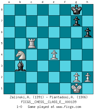 Last move : 1-0 2011 August 21 5:38:24 [Event "FICGS__CHESS__CLASS_E__000139"] [Site "FICGS"] [Date "2011.06.10"] [Round "1"] [White "Zalinski,Alexis"] [Black "Piantadosi,Angelo"] [Result "1-0"] [WhiteElo "1391"] [BlackElo "1306"] 1.f4 d5 2.Nf3 c5 3.b3 Nc6 4.Bb2 Nf6 5.e3 e6 6.Bb5 Bd7 7.O-O Bd6 8.Nc3 a6 9.Bxc6 Bxc6 10.Ne2 O-O 11.Ng3 Ne4 12.Qe1 Nxg3 13.Qxg3 f6 14.a4 b5 15.axb5 axb5 16.Rxa8 Qxa8 17.Ra1 Qb7 18.d3 b4 19.Nd2 Qc7 20.c4 e5 21.fxe5 Bxe5 22.Bxe5 Qxe5 23.Qxe5 fxe5 24.Ra6 Bb7 25.Rb6 Ba8 26.Rb5 Rc8 27.cxd5 Bxd5 28.e4 Be6 29.Nc4 Rd8 30.Rxc5 Rxd3 31.Nxe5 h6 32.Nxd3 Bxb3 33.Nxb4 1-0 Bird's Opening Kingside Castling by player White (move 7) Kingside Castling by player Black (move 10) 10 pieces endgame at move 33 : White KRNPPP , Black KBPP WHITE : King + 1 Rook 1 Knight 3 Pawns BLACK : King + 1 Bishop 2 Pawns Player White won this chess game. Follow this game move after move (download)We cannot resist the fascination of sacrifice, since a passion for sacrifices is part of a Chessplayer's nature. (Rudolf Spielman) Ich tröste mich mit dem Vergnügen, daß Schachfans, Zuschauer und Leser glücklich sind, wenn ein Großmeister etwas riskiert, statt nur Klötzchen zu schieben. (Mikhail Nekhemyevich Tal) Aquel que ve no otra dirección en el juego que la de dar Jaque Mate a su oponente, nunca será un buen jugador de Ajedrez. (Euwe) Le pion, dans sa simplicité, marche droit devant lui, mais lorsqu'il prend, il le fait obliquement? Ainsi l'homme, tant qu'il reste pauvre, marche dans la droiture et vit honnêtement, mais lorsqu'il recherche les honneurs, il flatte, se parjure et, par les voies obliques, cherche une position supérieure sur l'échiquier du monde. (Jean de Galles) Art is the triumph over chaos. (John Cheever)