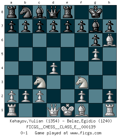 Last move : 0-1 2011 September 10 19:30:29 [Event "FICGS__CHESS__CLASS_E__000139"] [Site "FICGS"] [Date "2011.06.10"] [Round "1"] [White "Kehayov,Yulian"] [Black "Belaz,Egidio"] [Result "0-1"] [WhiteElo "1354"] [BlackElo "1240"] 1.d4 g6 2.Nf3 Nf6 3.Nc3 Bg7 4.e4 O-O 5.e5 Nh5 6.g4 Nf6 7.exf6 Bxf6 8.Bh6 Re8 9.g5 Bg7 0-1 Modern defense Kingside Castling by player Black (move 4) Player Black won this chess game. Follow this game move after move (download)Of all my Russian books, the defense contains and diffuses the greatest 'warmth' which may seem odd seeing how supremely abstract Chess is supposed to be. (Vladimir Nabokov) Nur ein wirklich starker Spieler weiß wie schwach er spielt. (Savielly Grigorievitsch Tartakower) Hay dos clases de hombres: aquellos que se conforman en dejarse llevar por las circunstancias y que juegan barajas y aquellos decididos a controlar las circunstancias y que juegan al Ajedrez. (Mortimer Collins) Soyez une menace à chaque fois que vous vous asseyez pour jouer. (Ken Smith) Live, lose, and learn, by observing your opponent how to win. (Amber Steenbock)