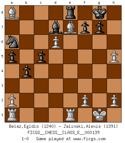 Last move : 1-0 2011 July 29 20:17:36 [Event "FICGS__CHESS__CLASS_E__000139"] [Site "FICGS"] [Date "2011.06.10"] [Round "1"] [White "Belaz,Egidio"] [Black "Zalinski,Alexis"] [Result "1-0"] [WhiteElo "1240"] [BlackElo "1391"] 1.e4 e5 2.Nf3 Nf6 3.Nc3 Bb4 4.Nd5 Nxd5 5.exd5 Bd6 6.Bc4 e4 7.Nd4 Qf6 8.c3 Bc5 9.O-O Bxd4 10.cxd4 Qxd4 11.Bb3 d6 12.Re1 O-O 13.d3 exd3 14.Be3 Qxb2 15.Qxd3 Qf6 16.Bd4 Qg6 17.Qb5 a6 18.Qc4 c5 19.Be3 Bh3 20.g3 Qf5 21.Bd1 b5 22.Qf4 Qxf4 23.Bxf4 Rd8 24.g4 h5 25.gxh5 a5 26.Bf3 Na6 27.Bg5 Re8 28.Be7 b4 29.Bxd6 Red8 30.Be7 Re8 31.d6 Bd7 32.Bxa8 1-0 Petrov Three knights game Kingside Castling by player White (move 9) Kingside Castling by player Black (move 12) Player White won this chess game. Follow this game move after move (download)A thorough understanding of the typical mating continuations makes the most complicated sacrificial combinations leading up to them not only not difficult, but almost a matter of course. (Siegbert Tarrasch) Zum Sieg gelangt man nicht, wenn man gut, sondern nur wenn man besser spielt (Savielly Grigorievitsch Tartakower) Aquel que ve no otra dirección en el juego que la de dar Jaque Mate a su oponente, nunca será un buen jugador de Ajedrez. (Euwe) Votre seul travail dans les ouvertures est d'obtenir un milieu de partie jouable. (Lajos Portish) The mind is like a parachute, it only functions when its open. (Unknown)