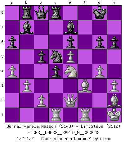 Last move : 1/2-1/2 2011 September 17 1:32:1 [Event "FICGS__CHESS__RAPID_M__000043"] [Site "FICGS"] [Date "2011.06.11"] [Round "1"] [White "Bernal Varela,Nelson"] [Black "Lim,Steve"] [Result "1/2-1/2"] [WhiteElo "2143"] [BlackElo "2112"] 1.e4 c5 2.Nf3 d6 3.d4 cxd4 4.Nxd4 Nf6 5.Nc3 a6 6.Bg5 e6 7.f4 Qb6 8.Nb3 Nbd7 9.Qf3 Qc7 10.a4 Be7 11.Be2 h6 12.Bh4 b6 13.O-O O-O 14.Bd3 Bb7 15.Qe2 Rfe8 16.Bg3 Qc6 17.h3 Nc5 18.Nxc5 bxc5 19.e5 Nh5 20.Bh2 g6 21.Be4 d5 22.Bf3 Ng7 23.g4 Rab8 24.Kg2 Red8 25.Rab1 Qd7 26.b3 d4 27.Rbd1 Ne8 28.Kh1 Qc8 29.Ne4 Nc7 30.f5 Nd5 31.fxg6 fxg6 1/2-1/2 Sicilian : Najdorf, 7...Qb6 Kingside Castling by player White (move 13) Kingside Castling by player Black (move 13) This chess game ended in a draw. Follow this game move after move (download)I believe that Chess possesses a magic that is also a help in advanced age. A rheumatic knee is forgotten during a game of Chess and other events can seem quite unimportant in comparison with a catastrophe on the chessboard. (Vlastimil Hort) Ivan Sokolov treibt mich als Beifahrer an mit go Loeky go - . (Loek van Wely) El Rey es una pieza de pelea. ¡Usenlo!. (Wilhelm Steinitz) Les Echecs sont et restent toujours un combat, un combat intégral comme la boxe, la lutte ou un autre sport, et où il doit y avoir un vainqueur et un vaincu. (Joseph Emil Diemer) Inventor: A person who makes an ingenious arrangement of wheels, levers and springs, and believes it civilization. (Ambrose Bierce, The Devil's Dictionary)