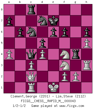 Last move : 1/2-1/2 2011 July 9 17:36:6 [Event "FICGS__CHESS__RAPID_M__000043"] [Site "FICGS"] [Date "2011.06.11"] [Round "1"] [White "Clement,George"] [Black "Lim,Steve"] [Result "1/2-1/2"] [WhiteElo "2201"] [BlackElo "2112"] 1.e4 e6 2.d4 d5 3.Nc3 Nf6 4.Bg5 Be7 5.e5 Nfd7 6.h4 c5 7.Bxe7 Kxe7 8.Nf3 Qb6 9.Na4 Qa5+ 10.c3 b6 11.a3 c4 12.b4 cxb3 13.Qxb3 Ba6 14.Bxa6 Qxa6 15.Nb2 Rc8 16.Qc2 h6 17.Rh3 Nc6 18.h5 Rg8 19.Nd3 Rac8 20.a4 Qc4 21.Rc1 f6 22.exf6+ gxf6 23.Nf4 Rg4 1/2-1/2 French : Albin-Alekhine-Chatard attack, Breyer variation This chess game ended in a draw. Follow this game move after move (download)Up to this point White has been following well-known analysis. But now he makes a fatal error: he begins to use his own head. (Siegbert Tarrasch) Ich würde mich als ganz normalen Jungen bezeichnen [Im Alter von 12]. (Sergej Karjakin) Coloca el contenido del tablero de Ajedrez en un sombrero, agita las piezas vigorosamente, derrámalas en el tablero desde una altura de medio metro y así obtienes el estilo de Wilhelm Steinitz. (H. E. Bird) Les Cavaliers se révèlent fort utiles dans les positions fermées. D'habitude, les Fous sont un peu plus forts que les Cavaliers dans les positions ouvertes. Qu'on le veuille ou non, il restera toujours des exceptions ! Beep ! (R2D2 in Star Wars ep.3)