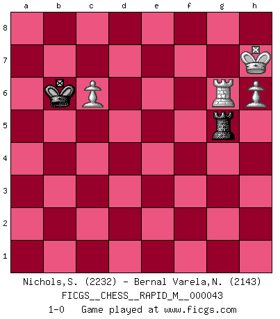 Last move : 1-0 2011 October 1 16:44:41 [Event "FICGS__CHESS__RAPID_M__000043"] [Site "FICGS"] [Date "2011.06.11"] [Round "1"] [White "Nichols,Scott"] [Black "Bernal Varela,Nelson"] [Result "1-0"] [WhiteElo "2232"] [BlackElo "2143"] 1.d4 Nf6 2.c4 g6 3.f3 c5 4.d5 d6 5.e4 a6 6.Nc3 Bg7 7.Bd3 O-O 8.Nge2 Nbd7 9.O-O Ne5 10.a4 Qa5 11.Be3 Re8 12.Nc1 Qb4 13.Qc2 Bd7 14.a5 b5 15.axb6 Qxb6 16.Be2 Rab8 17.Rb1 Qc7 18.Bd2 Bc8 19.f4 Ned7 20.Nd3 e6 21.dxe6 fxe6 22.Bf3 Bb7 23.Rbe1 e5 24.g4 exf4 25.g5 Nh5 26.Bxh5 gxh5 27.Nxf4 Bd4+ 28.Kh1 Qc8 29.Nxh5 Rf8 30.Bf4 Qe8 31.Ng3 Qg6 32.b3 Nb6 33.Nce2 Bg7 34.Kg1 Rbe8 35.Qd2 Bxe4 36.Bxd6 Rxf1+ 37.Rxf1 Nd7 38.Rf2 Ne5 39.Nxe4 Qxe4 40.Bxe5 Rxe5 41.Ng3 Qd4 42.Qxd4 cxd4 43.Nf5 Bf8 44.Kg2 d3 45.Nh6+ Bxh6 46.gxh6 Re3 47.Ra2 Kf8 48.Rxa6 d2 49.Rd6 Rxb3 50.Rxd2 Rb6 51.Rd4 Rxh6 52.Kg3 Ke8 53.Rh4 Rc6 54.Kf3 Kd8 55.Ke3 h6 56.Kd4 Ra6 57.Kd5 Kd7 58.c5 Rf6 59.Rh5 Kc7 60.h3 Rf1 61.Rxh6 Rd1+ 62.Ke6 Re1+ 63.Kf7 Rf1+ 64.Rf6 Rh1 65.Rf3 Kd7 66.Rc3 Kc7 67.c6 Rh2 68.Kg7 Rh1 69.Kh6 Rh2 70.Kh5 Rd2 71.h4 Rd8 72.Rc4 Rd1 73.Rc5 Rd2 74.Kh6 Rh2 75.h5 Rg2 76.Rg5 Rd2 77.Rg6 Rh2 78.Rf6 Rg2 79.Kh7 Rg5 80.h6 Kb6 81.Rg6 1-0 King's Indian defense Kingside Castling by player Black (move 7) Kingside Castling by player White (move 9) 10 pieces endgame at move 48 : White KRPPPP , Black KRPP WHITE : King + 1 Rook 4 Pawns BLACK : King + 1 Rook 2 Pawns 9 pieces endgame at move 49 : White KRPPP , Black KRPP WHITE : King + 1 Rook 3 Pawns BLACK : King + 1 Rook 2 Pawns 8 pieces endgame at move 50 : White KRPPP , Black KRP WHITE : King + 1 Rook 3 Pawns BLACK : King + 1 Rook 1 Pawn 7 pieces endgame at move 51 : White KRPP , Black KRP WHITE : King + 1 Rook 2 Pawns BLACK : King + 1 Rook 1 Pawn 6 pieces endgame at move 61 : White KRPP , Black KR WHITE : King + 1 Rook 2 Pawns BLACK : King + 1 Rook Player White won this chess game. Follow this game move after move (download)When you play Bobby, it is not a question if you win or lose. It is a question if you survive. (Boris Spassky) Man wirke der falschen Auffassung entgegen, als ob jeder Zug Unmittelbares zu leisten habe; auch Werte- und Ruhezüge haben ihre Existenzberechtigung. (Aaron Nimzowitsch) El Ajedrez es parte de la cultura, y si una cultura esta en decadencia, entonces también el Ajedrez declinará. (Mikhail Botvinnik) Je ne crois pas en la psychologie, je crois aux bons coups. (Robert Fischer) He who is a good ruler must first have been ruled. (Aristotle)
