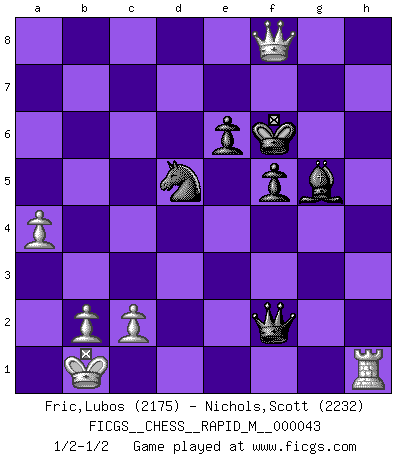 Last move : 1/2-1/2 2011 July 2 22:54:18 [Event "FICGS__CHESS__RAPID_M__000043"] [Site "FICGS"] [Date "2011.06.11"] [Round "1"] [White "Fric,Lubos"] [Black "Nichols,Scott"] [Result "1/2-1/2"] [WhiteElo "2175"] [BlackElo "2232"] 1.e4 e6 2.d4 d5 3.Nc3 Nf6 4.Bg5 dxe4 5.Nxe4 Be7 6.Bxf6 Bxf6 7.Nf3 O-O 8.Qd2 Nd7 9.O-O-O b6 10.Bd3 Bb7 11.h4 Be7 12.Qe2 c5 13.dxc5 Qc7 14.Neg5 h6 15.cxb6 Qf4+ 16.Kb1 hxg5 17.hxg5 g6 18.Bxg6 Bxf3 19.gxf3 Nxb6 20.Bh7+ Kg7 21.Be4 Rad8 22.Rh7+ Kg8 23.Rdh1 Bxg5 24.Qe1 Rfe8 25.Rg1 Rd2 26.Rh4 Qxh4 27.Qxd2 f6 28.f4 Kf7 29.Bc6 Bxf4 30.Bxe8+ Kxe8 31.Qd3 Bg5 32.Qd6 Kf7 33.Qb8 Qxf2 34.Qxa7+ Kg6 35.Rh1 f5 36.Qh7+ Kf6 37.Qh8+ Kg6 38.a4 Nd5 39.Qe8+ Kf6 40.Qf8+ 1/2-1/2 French : Burn variation Kingside Castling by player Black (move 7) Queenside Castling by player White (move 9) This chess game ended in a draw. Follow this game move after move (download)Could we look into the head of a Chess player, we should see there a whole world of feelings, images, ideas, emotion and passion. (Alfred Binet) Matt entspricht nicht immer den Tatsachen. (Savielly Grigorievitsch Tartakower) Cada Peón es potencialmente una Reina. (James Mason) Si rien de grave n'est détecté lors de l'analyse d'une position, on joue alors le coup. Seconde règle de Blumenfeld. Programmer - an organism that turns coffee into software. (Anonymous)