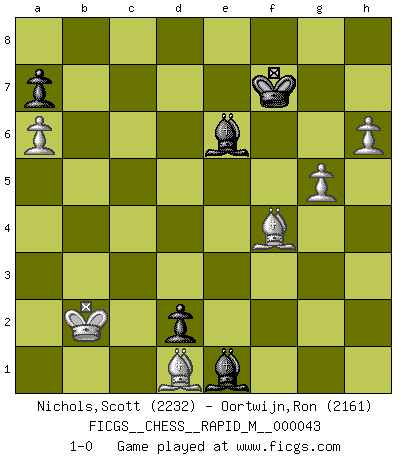 Last move : 1-0 2011 September 5 19:46:35 [Event "FICGS__CHESS__RAPID_M__000043"] [Site "FICGS"] [Date "2011.06.11"] [Round "1"] [White "Nichols,Scott"] [Black "Oortwijn,Ron"] [Result "1-0"] [WhiteElo "2232"] [BlackElo "2161"] 1.d4 f5 2.g3 Nf6 3.Bg2 e6 4.c4 d5 5.Qc2 c6 6.Nf3 Bd6 7.O-O O-O 8.Nc3 Qe8 9.Bd2 Nbd7 10.Rad1 Ne4 11.Nxe4 fxe4 12.Ng5 h6 13.Nh3 Nf6 14.Nf4 g5 15.Nh3 b6 16.f3 exf3 17.exf3 Ba6 18.Rfe1 Bxc4 19.f4 g4 20.Nf2 Qf7 21.f5 exf5 22.Qxf5 Nh5 23.Qxf7+ Kxf7 24.b3 Ba6 25.Nxg4 Rae8 26.Rxe8 Rxe8 27.Rc1 Bb7 28.Bxh6 Re6 29.Bd2 Nf6 30.Rf1 Ba6 31.Rxf6+ Rxf6 32.Nxf6 Kxf6 33.Kf2 Bd3 34.b4 Bb1 35.a4 Bc2 36.a5 Kf5 37.Bf3 Be7 38.h4 Bf6 39.Ke3 Ke6 40.Be1 Be7 41.g4 Bd6 42.Be2 bxa5 43.bxa5 c5 44.Kd2 Be4 45.dxc5 Bxc5 46.Kc3 Ke5 47.Bg3+ Kf6 48.Bf4 Bf2 49.a6 Be1+ 50.Kb3 d4 51.h5 d3 52.Bd1 Bd5+ 53.Kb2 Be6 54.h6 Kg6 55.Bf3 d2 56.Bd1 Kf7 57.g5 1-0 Dutch defense Kingside Castling by player White (move 7) Kingside Castling by player Black (move 7) Player White won this chess game. Follow this game move after move (download)The hallmark of the artist is simplicity. (Larry Evans) Bis zum Jahr 1971 verlief in meiner Schachkariere alles glatt. Dieses dramatische Match [Fischer-Taimanov 6:0] machte mein Leben zur Hölle. (Mark Taimanov) El ganar no lo es todo... pero el perder es nada. (Mednis) On croit qu'il y a plus de mauvais joueurs que de bons joueurs, c'est faux : Il y a autant de joueurs qui gagnent que de joueurs qui perdent. (Philippe Geluck) Opportunities multiply as they are seized. (Sun Tzu)