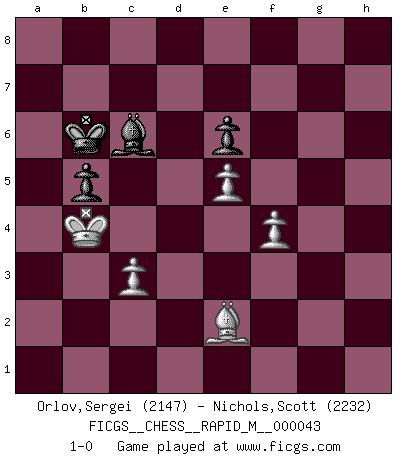 Last move : 1-0 2011 September 12 21:49:16 [Event "FICGS__CHESS__RAPID_M__000043"] [Site "FICGS"] [Date "2011.06.11"] [Round "1"] [White "Orlov,Vladimir"] [Black "Nichols,Scott"] [Result "1-0"] [WhiteElo "2147"] [BlackElo "2232"] 1.e4 e6 2.d4 d5 3.Nd2 Nf6 4.e5 Nfd7 5.Bd3 c5 6.c3 Nc6 7.Ngf3 Be7 8.O-O a5 9.Re1 cxd4 10.cxd4 g5 11.h3 h5 12.Nf1 g4 13.hxg4 hxg4 14.N3h2 Bb4 15.Re3 Qh4 16.Rg3 f5 17.exf6 Nxf6 18.Bf4 Kf7 19.Qc1 Rg8 20.Be5 Bd7 21.a3 Be7 22.Ne3 Ke8 23.Qe1 Kd8 24.Rc1 a4 25.Be2 Nxe5 26.dxe5 Ne4 27.Rxg4 Rxg4 28.Nhxg4 Bc6 29.g3 Qg5 30.Ng2 Kd7 31.Nf4 Rf8 32.Kg2 Rxf4 33.gxf4 Qxf4 34.f3 d4 35.Rd1 Nc3 36.bxc3 Qxg4+ 37.Qg3 Qxg3+ 38.Kxg3 Bxa3 39.Rxd4+ Ke7 40.Rd2 Bc1 41.Rc2 Be3 42.Bc4 b5 43.Ba2 Bb6 44.f4 Ba5 45.Kf2 Be4 46.Rc1 Bb6+ 47.Ke2 Bc5 48.Bb1 Ba3 49.Rd1 Bc6 50.Rg1 Bd5 51.Bd3 Bc5 52.Ra1 Bc6 53.Kd2 a3 54.Kc2 Kd7 55.Kb3 Kc7 56.Rxa3 Bd5+ 57.Kb2 Bxa3+ 58.Kxa3 Bc6 59.Kb4 Kb6 60.Be2 1-0 French : Tarrasch, Closed variation Kingside Castling by player White (move 8) 10 pieces endgame at move 57 : White KBPPP , Black KBBPP WHITE : King + 1 Bishop 3 Pawns BLACK : King + 2 Bishops 2 Pawns 9 pieces endgame at move 58 : White KBPPP , Black KBPP WHITE : King + 1 Bishop 3 Pawns BLACK : King + 1 Bishop 2 Pawns Player White won this chess game. Follow this game move after move (download)When I asked Fischer why he had not played a certain move in our game, he replied: 'Well, you laughed when I wrote it down !' (Mikhail Tal) Ich war schon mal beim Dopingtest. Da musste ich Urin abgeben, während Dritte zusahen. (Elisabeth Pähtz) Con o sin el título, Bobby Fischer fue sin lugar a dudas el mas grande jugador de su época. (Burt Hochberg) La menace est plus forte que l'exécution. (Aaron Nimzovitch) Without deviation from the norm, progress is not possible. (Frank Zappa)