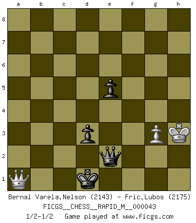 Last move : 1/2-1/2 2012 March 24 20:38:14 [Event "FICGS__CHESS__RAPID_M__000043"] [Site "FICGS"] [Date "2011.06.11"] [Round "1"] [White "Bernal Varela,Nelson"] [Black "Fric,Lubos"] [Result "1/2-1/2"] [WhiteElo "2143"] [BlackElo "2175"] 1.e4 c5 2.Nf3 d6 3.d4 cxd4 4.Nxd4 Nf6 5.Nc3 a6 6.Bg5 e6 7.Be2 Be7 8.O-O Nbd7 9.Qd3 h6 10.Bd2 Ne5 11.Qg3 g5 12.a3 Bd7 13.Rad1 Qc7 14.h3 Rg8 15.Qe3 h5 16.Bc1 Ng6 17.Nf3 g4 18.Ng5 gxh3 19.Qxh3 Ne5 20.Kh1 Rg7 21.f4 Neg4 22.Bxg4 Nxg4 23.Qxh5 O-O-O 24.Rd3 Nf6 25.Qe2 Rdg8 26.Be3 Bc6 27.a4 Rg6 28.b4 d5 29.e5 Rh8+ 30.Kg1 Nh5 31.Bd4 Nxf4 32.Rxf4 Bxg5 33.Rf1 Rgh6 34.b5 Rh1+ 35.Kf2 Bh4+ 36.Ke3 Qe7 37.Qf3 Rxf1 38.Qxf1 axb5 39.Nxb5 Kd7 40.Ke2 Qb4 41.Qxf7+ Be7 42.Nc3 Rc8 43.Qf4 Bxa4 44.Qd2 b5 45.g3 Rc4 46.Be3 Ke8 47.Kd1 Qa5 48.Nxa4 Qxa4 49.Bd4 Bb4 50.Qf2 Qa2 51.Rb3 Be1 52.Qe2 Rxd4+ 53.Kxe1 Re4 54.Re3 Rxe3 55.Qxe3 Qxc2 56.Qb6 Qc3+ 57.Kf2 Qxe5 58.Qxb5+ Kf8 59.Qa5 Kg7 60.Qb4 Kg6 61.Qg4+ Kf7 62.Kf3 Qg7 63.Qa4 Qf6+ 64.Kg2 d4 65.Qd7+ Kg6 66.Qc6 e5 67.Qd5 Kh5 68.Qa8 Qe6 69.Qe4 Kg5 70.Qh4+ Kg6 71.Qe4+ Qf5 72.Qd5 Qc2+ 73.Kh3 Qc8+ 74.Kg2 Kf6 75.Qe4 Qf5 76.Qc6+ Kg5 77.Qc1+ Kh5 78.Qd1+ Kg6 79.Qb3 Qe4+ 80.Kf2 Kg5 81.Qg8+ Qg6 82.Qd5 Qc2+ 83.Kf3 Qd3+ 84.Kg2 Qe2+ 85.Kh3 d3 86.Qd8+ Kf5 87.Qd7+ Ke4 88.Qb7+ Ke3 89.Qa7+ Kd2 90.Qa5+ Kd1 91.Qa1+ Kc2 92.Qa4+ Kd2 93.Qa5+ Kd1 94.Qa1+ Kc2 95.Qa4+ Kb2 96.Qb4+ Kc1 97.Qa3+ Kd1 98.Qa1+ 1/2-1/2 Sicilian : Najdorf, 6...e6 Kingside Castling by player White (move 8) Queenside Castling by player Black (move 23) 10 pieces endgame at move 55 : White KQPPP , Black KQPPP WHITE : King + 1 Queen 3 Pawns BLACK : King + 1 Queen 3 Pawns 9 pieces endgame at move 55 : White KQPP , Black KQPPP WHITE : King + 1 Queen 2 Pawns BLACK : King + 1 Queen 3 Pawns 8 pieces endgame at move 57 : White KQP , Black KQPPP WHITE : King + 1 Queen 1 Pawn BLACK : King + 1 Queen 3 Pawns 7 pieces endgame at move 58 : White KQP , Black KQPP WHITE : King + 1 Queen 1 Pawn BLACK : King + 1 Queen 2 Pawns This chess game ended in a draw. Follow this game move after move (download)The tactician must know what to do whenever something needs doing; the strategist must know what to do when nothing needs doing. (Savielly Tartakover) Was ist der Unterschied zwischen einem Strassenarbeiter und einem Schachspieler? --Der Schachspieler bewegt sich ab und zu. (Anonymous) Un juego de Ajedrez es un dialogo, una conversación entre un jugador y su oponente. Cada movimiento del oponente puede contener amenazas o tropiezos, pero un jugador no se puede defender de las amenazas o tomar ventaja de los tropiezos si es que no se pregunta a sí mismo: ¿Que es lo que mi oponente va a hacer después de cada movida?. (Bruce A. Moon) Les Echecs mettent en conflit, non pas deux intelligences, mais deux volontés. (Lasker) They say in chess you've got to kill the queen, and then you mate it... Oh I, do you ? (Red Hot Chili Peppers, Fortune faded)