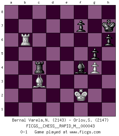 Last move : 0-1 2011 November 5 22:26:43 [Event "FICGS__CHESS__RAPID_M__000043"] [Site "FICGS"] [Date "2011.06.11"] [Round "1"] [White "Bernal Varela,Nelson"] [Black "Orlov,Vladimir"] [Result "0-1"] [WhiteElo "2143"] [BlackElo "2147"] 1.e4 e6 2.d4 d5 3.Nd2 c5 4.Ngf3 Nc6 5.exd5 exd5 6.Bb5 Bd6 7.O-O Nge7 8.dxc5 Bxc5 9.Nb3 Bd6 10.Re1 O-O 11.Bd3 h6 12.h3 Nf5 13.c3 Qf6 14.Bc2 Rd8 15.Qd3 g6 16.Bd2 a5 17.Qe2 a4 18.Bxf5 Qxf5 19.Nbd4 Qh5 20.Rad1 Nxd4 21.Nxd4 Qxe2 22.Nxe2 g5 23.Be3 Ra6 24.Nd4 Bd7 25.g4 Re8 26.Nc2 Bb5 27.Bd4 Rxe1+ 28.Rxe1 Ra8 29.f3 Kh7 30.Nb4 a3 31.Nxd5 axb2 32.c4 Rxa2 33.Bxb2 Bxc4 34.Nf6+ Kg6 35.Bd4 Be6 36.Ne4 Bh2+ 37.Kh1 Bf4 38.Rb1 Rh2+ 39.Kg1 Rxh3 40.Kg2 Rh2+ 41.Kg1 Rc2 42.Rxb7 Rc4 43.Bc3 Bxg4 44.fxg4 Rxe4 45.Kf2 Rc4 46.Rb6+ Kh7 0-1 French : Tarrasch, Open variation Kingside Castling by player White (move 7) Kingside Castling by player Black (move 10) 10 pieces endgame at move 44 : White KRBP , Black KRBPPP WHITE : King + 1 Rook 1 Bishop 1 Pawn BLACK : King + 1 Rook 1 Bishop 3 Pawns Player Black won this chess game. Follow this game move after move (download)All that matters on the Chessboard is good moves. (Bobby Fischer) Im Blitz ist es einfacher mit einer Figur weniger anzugreifen, als sich mit einer Mehrfigur zu verteidigen. (Mikhail Nekhemyevich Tal) Aquel que ve no otra dirección en el juego que la de dar Jaque Mate a su oponente, nunca será un buen jugador de Ajedrez. (Euwe) Il n'y a pas eu de défaite parce que je ne crois pas que cet ordinateur ait jamais existé. IBM a triché en refusant d'imprimer les modes de recherche de la machine. C'est évident, pendant le match, des coups décisifs ont été joués par des êtres humains. Aujourd'hui, les meilleurs spécialistes en informatique ne peuvent toujours pas expliquer comment Deep-Blue a pu jouer contre la logique des ordinateurs. IBM a gagné une guerre de communication, mais ils sont incapables de prouver que l'ordinateur a gagné tout seul. (Garry Kasparov) Fame, I have already. Now I need the money. (an elderly Steinitz)
