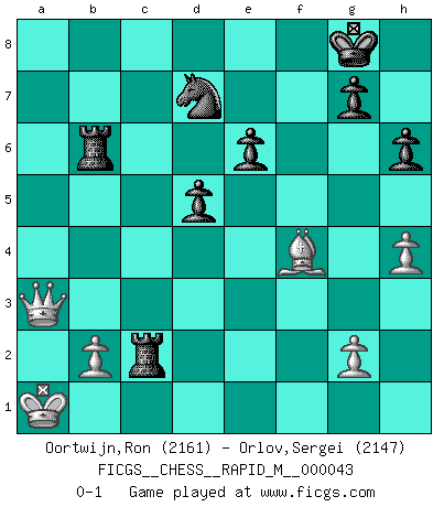 Last move : 0-1 2011 October 1 9:52:9 [Event "FICGS__CHESS__RAPID_M__000043"] [Site "FICGS"] [Date "2011.06.11"] [Round "1"] [White "Oortwijn,Ron"] [Black "Orlov,Vladimir"] [Result "0-1"] [WhiteElo "2161"] [BlackElo "2147"] 1.e4 e6 2.d4 d5 3.Nc3 Nf6 4.e5 Nfd7 5.f4 c5 6.Nf3 Nc6 7.Be3 a6 8.Qd2 b5 9.a3 Bb7 10.O-O-O b4 11.axb4 cxd4 12.Nxd4 Bxb4 13.Kb1 O-O 14.h4 a5 15.Bb5 Qc7 16.Nf3 Rab8 17.Qd3 Ncxe5 18.fxe5 Bxc3 19.Bc1 Rfc8 20.Ng5 Nf8 21.Rhf1 f5 22.exf6 Bxf6 23.Rf2 h6 24.Rdf1 Ba8 25.Nh3 Be5 26.Qe2 Rb6 27.Bd3 Nd7 28.Nf4 Qc3 29.Bb5 Bc6 30.Rf3 Bxb5 31.Rxc3 Bxc3 32.Nd3 a4 33.Ka1 Bd4 34.Rf4 Be5 35.Qd1 Bxd3 36.Qxd3 a3 37.Qxa3 Bxf4 38.Bxf4 Rxc2 0-1 French : Steinitz, Boleslavsky variation Queenside Castling by player White (move 10) Kingside Castling by player Black (move 13) Player Black won this chess game. Follow this game move after move (download)I played Chess with him and would have beaten him sometimes only he always took back his last move, and ran the game out differently. (Mark Twain) Schach verlangt totale Konzentration. (Robert James Fischer) Siempre es mejor sacrificar los hombres de tu oponente. (Savielly Tartakower) Celui qui prend des risques peut perdre, celui qui n'en prend pas perd toujours. (Xavier Tartacover) It's not the will to win, but the will to prepare to win that makes the difference. (Bear Bryant)