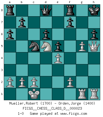Last move : 1-0 2007 January 25 13:5:29 [Event "FICGS__CHESS__CLASS_D__000023"] [Site "FICGS"] [Date "2006.12.24"] [Round "1"] [White "Mueller,Robert"] [Black "Orden,Jorge"] [Result "1-0"] [WhiteElo "1700"] [BlackElo "1400"] 1.e4 c5 2.Nf3 d6 3.Bb5+ Bd7 4.Nc3 Nf6 5.Bxd7+ Nbxd7 6.d4 cxd4 7.Qxd4 e5 8.Qd3 Nc5 9.Qe2 Be7 10.Bg5 O-O 11.O-O-O a6 12.h4 h6 13.Bxf6 Bxf6 14.g4 Qb6 15.g5 Be7 16.gxh6 gxh6 17.Nd5 Qd8 18.Rdg1+ Kh7 19.Ng5+ Kh8 20.Qh5 Bxg5+ 21.hxg5 1-0 Sicilian : Canal-Sokolsky attack, 3...Bd7 Kingside Castling by player Black (move 10) Queenside Castling by player White (move 11) Player White won this chess game. Follow this game move after move (download)The tactician knows what to do when there is something to do; whereas the strategian knows what to do when there is nothing to do. (Gerald Abrahams) Das Schachspiel übertrifft alle anderen Spiele so weit wie der Chimborasso einen Misthaufen. (Arthur Schopenhauer) No es suficiente ser un buen jugador, se debe también de jugar bién. (Siegbert Tarrasch) Ne tendez aucun piège pour le plaisir ! Ne jouez rien dans l'espoir que l'adversaire réagisse de façon stupide ! Prenez toujours pour acquis que l'adversaire va trouver le meilleur coup ! Ne jouez jamais de coup dans l'espoir que l'adversaire ne voie pas la menace ! Chacun de vos coups doit améliorer la position d'une façon ou d'une autre. However beautiful the strategy, you should occasionally look at the results. (Winston Churchill)