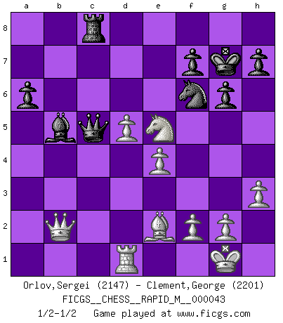 Last move : 1/2-1/2 2011 September 4 18:45:14 [Event "FICGS__CHESS__RAPID_M__000043"] [Site "FICGS"] [Date "2011.06.11"] [Round "1"] [White "Orlov,Vladimir"] [Black "Clement,George"] [Result "1/2-1/2"] [WhiteElo "2147"] [BlackElo "2201"] 1.e4 e5 2.Nf3 Nc6 3.Bb5 a6 4.Ba4 Nf6 5.O-O Be7 6.Re1 b5 7.Bb3 d6 8.c3 O-O 9.h3 Na5 10.Bc2 c5 11.d4 Qc7 12.Nbd2 cxd4 13.cxd4 Be6 14.d5 Bd7 15.Nf1 Rfc8 16.Bd3 Nb7 17.Be3 Nc5 18.Rc1 Qb8 19.Bxc5 Rxc5 20.Rxc5 dxc5 21.b3 Bd6 22.Ne3 Qc7 23.Qc2 g6 24.Be2 Kg7 25.Nd2 Qa5 26.Rc1 Rc8 27.Ra1 Qb4 28.a3 Qd4 29.Rd1 c4 30.bxc4 Bxa3 31.Nb1 Qb2 32.Nxa3 Qxa3 33.Qb1 Qc5 34.Qb2 bxc4 35.Nxc4 Bb5 36.Nxe5 1/2-1/2 Ruy Lopez : Closed Kingside Castling by player White (move 5) Kingside Castling by player Black (move 8) This chess game ended in a draw. Follow this game move after move (download)I love all positions. Give me a difficult positional game, I will play it. But totally won positions, I cannot stand them. (Hein Donner) Es macht mich traurig, wenn ich sehe, dass Golfprofis mehr verdienen als Schachsportler. Obwohl ich davon überzeugt bin, dass wir Schachspieler viel härter trainieren müssen als die Golfer. (Alexandra Kosteniuk) El sobresalir en el Ajedrez es un signo de una mente intrigante. (Sir Arthur Conan Doyle) Les échecs c'est le défi de l'alpiniste, toujours plus haut, prêt à tout pour monter à l'assaut du Roi ennemi. Les échecs, c'est de la musique en mouvement, un ballet majestueux pour les yeux. C'est de la poésie composée par les fantômes du passé qui au même titre que Rimbaud ou Verlaine méritent notre admiration. Les échecs, c'est de la peinture ou le moindre mouvement modifie le tableau pour en faire un Picasso ou un Van Gogh. Les échecs, c'est tout et rien, c'est la vie et la mort. Jjulie33 sur le forum de France-Echecs. After growing wildly for years, the field of computing appears to be reaching its infancy. (John Pierce)