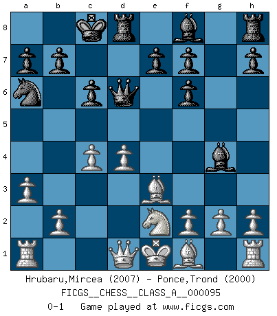 Last move : 0-1 2011 September 28 11:4:41 [Event "FICGS__CHESS__CLASS_A__000095"] [Site "FICGS"] [Date "2011.06.11"] [Round "1"] [White "Hrubaru,Mircea"] [Black "Ponce,Trond"] [Result "0-1"] [WhiteElo "2007"] [BlackElo "2000"] 1.e4 c6 2.d4 d5 3.Nc3 dxe4 4.Nxe4 Nf6 5.Nxf6+ gxf6 6.c3 Qd5 7.c4 Qd6 8.Ne2 Na6 9.a3 Bg4 10.Be3 O-O-O 0-1 This chess game has been lost on time (started : 2011.06.11 19:24:32) Caro-Kann : Bronstein-Larsen variation Queenside Castling by player Black (move 10) Player Black won this chess game. Follow this game move after move (download)You need not play well - just help your opponent to play badly. (Genrikh Chepukaitis) Offensichtlich kennt Kasparow nichts anderes als Schach, und ich könnte 500 weitere Spieler dieser Sorte benennen. (Judith Polgar) El Ajedrez detiene a su maestro dentro de sus propios vínculos, encadenando la mente y el cerebro, por lo que la libertad interior del mas fuerte debe sufrir. (Albert Einstein) Ce qui caractérise les parties de combat, c'est que si le défenseur a constamment de difficiles problèmes à résoudre, l'attaquant doit chercher sans relâche de nouvelles possibilités d'attaque. (Koblentz) Industry executives and analysts often mistakenly talk about strategy as if it were some kind of chess match. But in chess, you have just two opponents, each with identical resources, and with luck playing a minimal role. The real world is much more like a poker game, with multiple players trying to make the best of whatever hand fortune has dealt them. In our industry, Bill Gates owns the table until someone proves otherwise. (David Moschella, 'Computerworld')