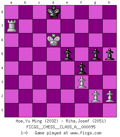 Last move : 1-0 2011 September 5 8:46:0 [Event "FICGS__CHESS__CLASS_A__000095"] [Site "FICGS"] [Date "2011.06.11"] [Round "1"] [White "Hoe,Yu Ming"] [Black "Riha,Josef"] [Result "1-0"] [WhiteElo "2032"] [BlackElo "2051"] 1.e4 c5 2.Nf3 d6 3.d4 cxd4 4.Nxd4 Nf6 5.Nc3 a6 6.Be3 e5 7.Nb3 Be6 8.Be2 Be7 9.Qd3 Nc6 10.a3 O-O 11.O-O Rc8 12.Rac1 Na5 13.Nxa5 Qxa5 14.b4 Qc7 15.Nd5 Nxd5 16.exd5 Bd7 17.c4 f5 18.f3 b6 19.Qd2 f4 20.Bf2 Kh8 21.Rfe1 Be8 22.a4 Bxa4 23.b5 g6 24.Ra1 axb5 25.cxb5 Bb3 26.Rec1 Qd7 27.Qd3 Rxc1+ 28.Rxc1 Ba2 29.Bxb6 Rc8 30.Rc6 Kg8 31.Qc2 Ra8 32.Rc7 Qe8 33.Qc6 Qxc6 34.dxc6 Bd8 35.Rb7 Bxb6+ 36.Rxb6 Rc8 37.Kf2 Bd5 38.Ra6 Kf8 39.Bd3 Kg8 40.Ke2 Kh8 41.Kd2 Kg8 42.Kc3 Kf7 43.Ra7+ Ke6 44.c7 Kd7 45.b6 h5 46.Bb5+ Ke6 47.Bc4 Bxc4 48.Kxc4 g5 49.Kb5 Kd7 50.b7 Kxc7 51.bxc8Q+ Kxc8 52.Kc6 Kd8 53.Kxd6 1-0 Sicilian : Najdorf, Byrne (English) attack Kingside Castling by player Black (move 10) Kingside Castling by player White (move 11) Promotion Queen by player White (move 51) 10 pieces endgame at move 53 : White KRPPP , Black KPPPP WHITE : King + 1 Rook 3 Pawns BLACK : King + 4 Pawns Player White won this chess game. Follow this game move after move (download)I still hope to kill Fischer. (Boris Spassky) Die Arbeit ist etwas Unnatürliches. Die Faulheit allein ist göttlich. (Anatole France) La mitad de las variaciones que son calculadas en una partida de torneo, resultan ser completamente superfluas. Desafortunadamente, nadie sabe por adelantado cual mitad. (Jan Tinman) Un millionnaire : 'Monsieur Steinitz ! Vous ne participez aux tournois que pour l'argent, alors que moi je n'y viens que pour l'honneur.' Steinitz : 'Chacun joue pour ce qu'il n'a pas'... It's not a bug - it's an undocumented feature. (Anonymous)