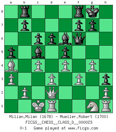 Last move : 0-1 2007 February 24 8:25:40 [Event "FICGS__CHESS__CLASS_D__000023"] [Site "FICGS"] [Date "2006.12.24"] [Round "1"] [White "Milian,Milan"] [Black "Mueller,Robert"] [Result "0-1"] [WhiteElo "1678"] [BlackElo "1700"] 1.c4 e5 2.Nc3 Nc6 3.g3 Bc5 4.Bg2 Nf6 5.e4 d6 6.d3 Ng4 7.Nh3 h6 8.Nd5 a5 9.Ne3 Nxe3 10.Bxe3 Bb4+ 11.Bd2 h5 12.Bc3 Nd4 13.a3 Bc5 14.Ng1 h4 15.Bxd4 Bxd4 16.Qd2 h3 17.Bf3 Qf6 18.Bd1 Bc5 19.Ba4+ c6 20.f3 O-O 21.O-O-O Rb8 22.g4 Be6 0-1 English : Sicilian Reversed Kingside Castling by player Black (move 20) Queenside Castling by player White (move 21) Player Black won this chess game. Follow this game move after move (download)At this time Fischer is simply a level above all the best Chessplayers in the world. (John Jacobs) Jeder Schachmeister war einmal ein Anfänger. (Irving Chernev) Cuando la partida de Ajedrez termina, el Peón y el Rey regresan a la misma caja. (Irish saying) Le système Elo représente seulement une moyenne. Il est simplement un indicateur de votre stabilité. (Anatoli Karpov) Opportunities multiply as they are seized. (Sun Tzu)
