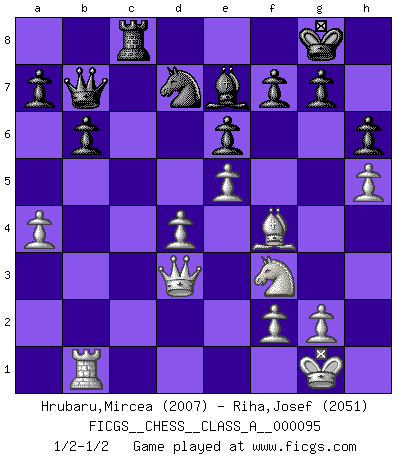 Last move : 1/2-1/2 2011 July 24 21:27:44 [Event "FICGS__CHESS__CLASS_A__000095"] [Site "FICGS"] [Date "2011.06.11"] [Round "1"] [White "Hrubaru,Mircea"] [Black "Riha,Josef"] [Result "1/2-1/2"] [WhiteElo "2007"] [BlackElo "2051"] 1.d4 Nf6 2.c4 e6 3.Nf3 b6 4.a3 Bb7 5.Nc3 d5 6.cxd5 Nxd5 7.Qc2 Nxc3 8.bxc3 Be7 9.e4 O-O 10.Bd3 c5 11.O-O Qc7 12.Qe2 Nd7 13.e5 Rac8 14.h4 Rfd8 15.h5 h6 16.Rd1 cxd4 17.cxd4 Bd5 18.Bf4 Qc6 19.a4 Bc4 20.Rac1 Bxd3 21.Qxd3 Qb7 22.Rxc8 Rxc8 23.Rb1 1/2-1/2 Queen's Indian : Petrosian system Kingside Castling by player Black (move 9) Kingside Castling by player White (move 11) This chess game ended in a draw. Follow this game move after move (download)We must make sure that Chess will not be like a dead language, very interesting, but for a very small group. (Sytze Faber) Ein Schachgenie ist jemand der verdammt gut Schach spielt. (Jonathan Levitt) En el Ajedrez, tal como es jugado por los Maestros, practicamente la suerte es eliminada. (Emanuel Lasker) Le plus grand jeu de l'esprit jamais inventé, plus vous l'apprenez, plus vous y prenez du plaisir. (Garry Kasparov) Bobby never cared about money, though. His only desire was to prove that his choices were correct: He wanted chess to be important because he was a chess player, and he wanted to be important. Bobby knew money was important, but he didn't have a clue why, outside of clothes and status. The only way he could accomplish what he wanted was to fight for a lot of money. Once he got it, he gave it away. He did not know how to spend it. And once he'd become champion, after, essentially, sacrificing his life for it, he didn't know how to spend his time. (Bob Wade)