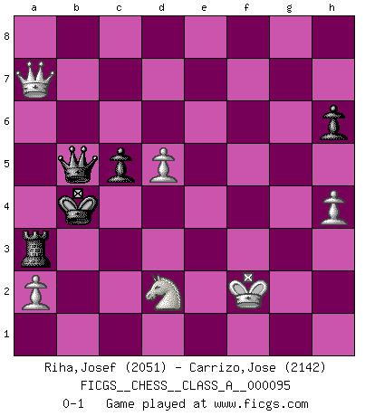 Last move : 0-1 2011 November 8 10:18:20 [Event "FICGS__CHESS__CLASS_A__000095"] [Site "FICGS"] [Date "2011.06.11"] [Round "1"] [White "Riha,Josef"] [Black "Carrizo,Jose"] [Result "0-1"] [WhiteElo "2051"] [BlackElo "2142"] 1.d4 d6 2.Nf3 g6 3.c4 Bg7 4.Nc3 c5 5.d5 Bxc3+ 6.bxc3 f5 7.g3 Qa5 8.Qb3 Nd7 9.Bg2 Nb6 10.Bf4 Bd7 11.Nd2 Nf6 12.Rb1 h6 13.h4 Ba4 14.Qb2 Qa6 15.O-O O-O-O 16.e4 Rdg8 17.e5 g5 18.exf6 gxf4 19.fxe7 Rg7 20.Bh3 Bd7 21.Qc2 fxg3 22.fxg3 Nxc4 23.Bxf5 Ne3 24.Qe4 Nxf5 25.Rxf5 Re8 26.Rf8 Rxg3+ 27.Kf2 Rxc3 28.Rb2 Kc7 29.Rxe8 Bxe8 30.Qb1 Bh5 31.Qe4 Qd3 32.e8N+ Bxe8 33.Qe7+ Bd7 34.Rxb7+ Kxb7 35.Qxd7+ Ka6 36.Qxd6+ Ka5 37.Qc7+ Kb4 38.Qb7+ Qb5 39.Qxa7 Ra3 0-1 Queen's Pawn Kingside Castling by player White (move 15) Queenside Castling by player Black (move 15) Promotion Knight by player White (move 32) Player Black won this chess game. Follow this game move after move (download)Some sacrifices are sound; the rest are mine. (Mikhail Tal) Man gibt nur Pakete auf. (Paul Keres) Una buena ofensiva y una buena defensa, comienzan ambas con un buen desarrollo. (Bruce A. Moon) Nous vivons dans un monde échiquéen : chaque jour qui passe est un défi à relever. (Philosophe Sasha) Art is the only way to run away without leaving home. (Twyla Tharp)