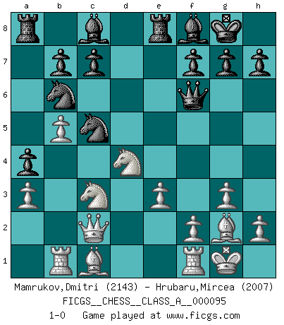Last move : 1-0 2011 September 3 22:17:18 [Event "FICGS__CHESS__CLASS_A__000095"] [Site "FICGS"] [Date "2011.06.11"] [Round "1"] [White "Mamrukov,Dmitri"] [Black "Hrubaru,Mircea"] [Result "1-0"] [WhiteElo "2143"] [BlackElo "2007"] 1.c4 Nf6 2.g3 e5 3.Bg2 d5 4.cxd5 Nxd5 5.Nc3 Nb6 6.Nf3 Nc6 7.O-O Be7 8.a3 O-O 9.b4 Re8 10.Rb1 Bf8 11.d3 a5 12.b5 Nd4 13.Nd2 a4 14.e3 Ne6 15.Nf3 Nc5 16.d4 exd4 17.Nxd4 Qf6 18.Qc2 1-0 This chess game has been lost on time (started : 2011.06.11 19:24:32) English, 1...Nf6 (Anglo-Indian defense) Kingside Castling by player White (move 7) Kingside Castling by player Black (move 8) Player White won this chess game. Follow this game move after move (download)Any material change in a position must come about by mate, a capture, or a Pawn promotion. (Purdy) Ich würde die 30 stärksten Spieler der USA im Simultanspiel besiegen. (José Raúl Capablanca) Combinaciones deslumbrantes son para la mayoría, mover madera es para los pocos. (Georg Kieninger) Le temps de noter son nom sur la feuille de partie, j'étais déjà en zeitnot ! D'un modeste amateur apparié lors de la première ronde d'un open contre le grand-maître Azmaïparashvili. I know the human being and fish can coexist peacefully. (George W. Bush, Saginaw sept. 29, 2000)