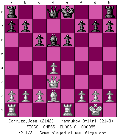 Last move : 1/2-1/2 2011 July 14 4:22:38 [Event "FICGS__CHESS__CLASS_A__000095"] [Site "FICGS"] [Date "2011.06.11"] [Round "1"] [White "Carrizo,Jose"] [Black "Mamrukov,Dmitri"] [Result "1/2-1/2"] [WhiteElo "2142"] [BlackElo "2143"] 1.e4 c6 2.d4 d5 3.Nc3 dxe4 4.Nxe4 Nd7 5.Nf3 Ngf6 6.Nxf6+ Nxf6 7.Ne5 Nd7 8.Nxd7 Bxd7 9.Bd3 Bf5 10.O-O Bxd3 11.Qxd3 e6 12.Re1 Bd6 13.Bd2 1/2-1/2 Caro-Kann : Steinitz variation Kingside Castling by player White (move 10) This chess game ended in a draw. Follow this game move after move (download)Best by test: 1. e4 (Bobby Fischer) Sie führen leise Selbstgespräche, schlürfen lautstark ihre Getränke, schmatzen hörbar beim Essen, blasen ihrem Gegenüber Rauch in die Augen, niesen ihm ins Gesicht, starren ihn unverwandt an, bis er sich unter ihren Blicken windet, rutschen ständig auf ihrem Stuhl hin und her, rülpsen und bohren in der Nase. (Anonymous) Es muy difícil jugar en contra de la teoría de Einstein. - en su primera derrota en contra de Fischer (Mikhail Tal) C'est la seule position que je connaisse où les deux camps sont mals. Propos prêtés à V. Anand. To steal ideas from one person is plagiarism. To steal from many is research. (Unknown)
