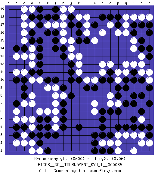 Last move : 0-1 2011 October 27 18:54:29 [Event "FICGS__GO__TOURNAMENT_KYU_I__000036"] [Site "FICGS"] [Date "2011.06.14"] [Round "1"] [Black "Grosdemange,David"] [White "Ilie,Sebastian"] [Result "0-1"] [Rating 1 "0600"] [Rating 2 "0706"] 1.d3 c16 2.r4 q16 3.e17 g17 4.e15 d14 5.g14 h15 6.h13 j13 7.j12 k13 8.h14 j15 9.o3 d5 10.c4 c5 11.g3 e3 12.e4 d4 13.e2 c3 14.f3 c2 15.k4 k12 16.j11 k11 17.j10 d10 18.e14 d13 19.e12 d12 20.e11 e10 21.f10 f9 22.g10 g9 23.h9 g7 24.q10 q12 25.n10 n12 26.k10 q3 27.q4 p3 28.p4 o2 29.n3 n2 30.m3 r3 31.e5 e6 32.d11 c11 33.h7 g6 34.h6 g5 35.h5 q8 36.p8 p7 37.q7 o8 38.p9 q6 39.r7 r6 40.p6 o7 41.r8 p5 42.o6 o5 43.n6 o4 44.s4 s7 45.s8 q5 46.s6 s5 47.t7 m7 48.r5 m6 49.n5 l10 50.l9 m10 51.m9 n11 52.o10 p11 53.m2 s3 54.n4 d17 55.r11 r12 56.m17 o17 57.n18 l18 58.k17 l17 59.r17 q17 60.r16 r15 61.s15 r14 62.s14 r18 63.s17 s18 64.t16 s13 65.t14 s11 66.g18 h18 67.f18 h17 68.d18 c18 69.d16 c17 70.d15 c15 71.e13 d1 72.c10 b11 73.c9 d8 74.c8 d7 75.b10 d19 76.e18 c7 77.b7 b6 78.c14 c13 79.b14 b13 80.j18 k18 81.j17 j19 82.k16 l16 83.k15 j14 84.l15 m15 85.g19 h19 86.o11 o12 87.g16 h16 88.g15 g4 89.h4 e1 90.f1 d2 91.e3 p10 92.q9 q11 93.r10 f17 94.f16 h8 95.j8 g8 96.t3 t2 97.t4 s2 98.n1 p1 99.m1 r1 100.o1 p2 101.e19 c19 102.s10 t10 103.t9 t11 104.b4 b5 105.b3 b2 106.p18 t18 107.t17 q18 108.t13 s12 109.p17 p16 110.o18 n16 111.f5 f6 112.f4 pass 0-1 Here are the names of the openings (joseki) played in the four corners : Corner d16 : c16 e17 Komoku (Somok, Xiao~mu`) 3-4 Point. The komoku (3-4) point is the traditional corner enclosure move.. Ikken Kakari (Hankan Keolch'im, Yi Gua`jiao~, 1-Space Low Pincer). The small knight move is the basic approach move to the 3-4 point stone. It has been continually used for over four centuries. There are limitless variations, with new moves constantly being discovered. Black 2 opens the door to a treaure store of joseki. Corner d4 : d3 d5 Komoku (Somok, Xiao~mu`) 3-4 Point. The komoku (3-4) point is the traditional corner enclosure move.. Ikken Takagakari (Hankan Nop'dakeolch'im, Yi Gaogua`jiao~, 1-Space High Approach). The 5-4 approach move has become more popular in modern times, as modern Go emphasizes speed and influence. Player White won this Go (weiqi, baduk) game. Follow this game move after move (download)More haste less speed. (John Fairbairn) Men should grow up. - Yeah. And dogs should stop licking themselves. It's not gonna happen. (Gregory House to Dr. Cameron, House M.D.)