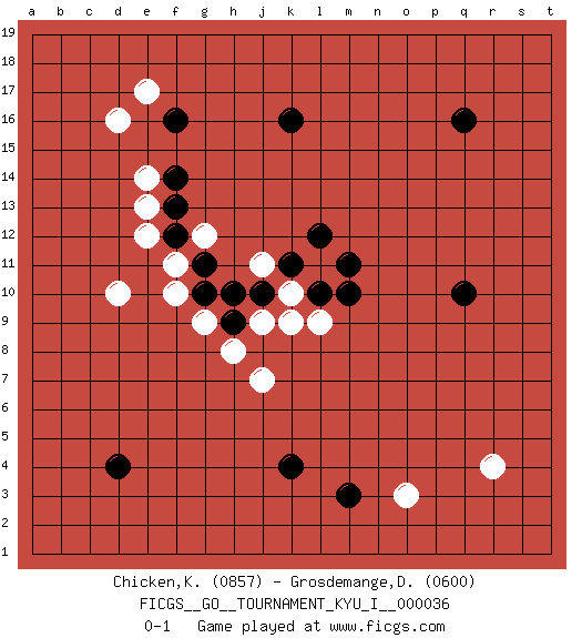 Last move : 0-1 2011 August 13 6:26:22 [Event "FICGS__GO__TOURNAMENT_KYU_I__000036 "] [Site "FICGS"] [Date "2011.06.14"] [Round "1"] [Black "Chicken,Kung Pow "] [White "Grosdemange,David "] [Result "0-1"] [Rating 1 "0857"] [Rating 2 "0600"] 1.q16 r4 2.d4 d16 3.q10 o3 4.k4 d10 5.k16 k10 6.f16 e17 7.m3 e14 8.f14 e13 9.f13 e12 10.f12 f11 11.g11 f10 12.g10 g9 13.j10 j9 14.h9 h8 15.h10 j7 16.k11 k9 17.l10 l9 18.m10 l11 19.l12 j11 20.m11 g12 0-1 Here are the names of the openings (joseki) played in the four corners : Corner d16 : d16 f16Hoshi (Hwajeom, Seongjeom, Xingwei`) 4-4 Point. The star or hoshi (4-4) point, emphasizing influence at the potential expense of territory.Ikken Takagakari (Hankan Nop'dakeolch'im, Yi Gaojia, 1-Space High Approach). White typically responds at 6-4 or 3-10. White 4-10 is played when White finds play on the right side advantageous. White 4-8 or 3-8 may be played when White has support at top. Corner d4 : d4 g9Hoshi (Hwajeom, Seongjeom, Xingwei`) 4-4 Point. The star or hoshi (4-4) point, emphasizing influence at the potential expense of territory. Corner q16 : q16 l11Hoshi (Hwajeom, Seongjeom, Xingwei`) 4-4 Point. The star or hoshi (4-4) point, emphasizing influence at the potential expense of territory. Player White won this Go (weiqi, baduk) game.Follow this game move after move (download ) Atari, atari is vulgar play. (Anonymous) The quality of decision is like the well-timed swoop of a falcon which enables it to strike and destroy its victim. (Sun Tzu)