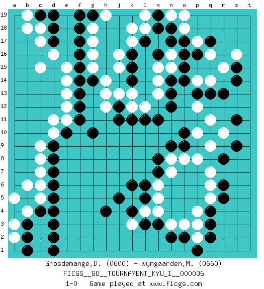 Last move : 1-0 2011 November 8 15:57:55 [Event "FICGS__GO__TOURNAMENT_KYU_I__000036"] [Site "FICGS"] [Date "2011.06.14"] [Round "1"] [Black "Grosdemange,David"] [White "Wyngaarden,Martin"] [Result "1-0"] [Rating 1 "0600"] [Rating 2 "0660"] 1.d4 q16 2.q3 c15 3.d17 d16 4.f17 k17 5.r5 r10 6.r13 d10 7.p13 q11 8.s15 s16 9.s11 c5 10.c4 b4 11.d5 c6 12.h4 k5 13.k4 l4 14.l5 m5 15.l6 m6 16.k6 p3 17.j5 q5 18.q4 p4 19.r6 q6 20.n13 g17 21.f16 n15 22.m7 n7 23.m8 n8 24.n9 o8 25.g10 m13 26.n12 l12 27.m11 h13 28.f13 g16 29.f15 g15 30.g14 h14 31.o9 p8 32.r8 q9 33.s9 e13 34.f12 e12 35.f11 e11 36.d8 c8 37.d9 c9 38.e10 d11 39.o17 o18 40.o15 p17 41.o16 n16 42.n17 m17 43.n18 o19 44.m18 l18 45.n14 m14 46.m16 m15 47.l17 k18 48.k16 j16 49.k15 j15 50.k14 k13 51.j12 j13 52.l11 k12 53.k11 e15 54.d7 c7 55.d6 k3 56.l3 m4 57.m3 n3 58.n2 o3 59.o2 p2 60.q2 q7 61.p1 c3 62.d3 c2 63.d2 c1 64.d1 g18 65.f18 r15 66.s14 q14 67.q13 p10 68.o10 p14 69.o14 c17 70.d18 c18 71.c19 b19 72.d19 b18 73.g19 h19 74.f19 e14 75.f14 h12 76.j11 p12 77.b5 a5 78.b3 b6 79.b2 a3 80.p16 a2 81.b1 n19 82.m19 l19 83.q17 1-0 Here are the names of the openings (joseki) played in the four corners : Corner d16 : c15 d17 Mokuhazushi (Waemok, Wai`mu`) 5-3 Point. The mokuhazushi (5-3) point was popular in the Edo period in Japan (1600 - 1867). It emphasizes influence; territorially, it is inferior to the 3-4 point. Komoku Kakari. Black 2 is the standard approach because of its solidity and stability. Corner q16 : q16 r13 Hoshi (Hwajeom, Seongjeom, Xingwei`) 4-4 Point. The star or hoshi (4-4) point, emphasizing influence at the potential expense of territory. Niken Kakari (Dukan Keolch'im, E`r Gua`jiao~, 2-Space Low Approach). White typically answers by 7-3 or 3-5 (which is not joseki). Corner d4 : d4 c5 Hoshi (Hwajeom, Seongjeom, Xingwei`) 4-4 Point. The star or hoshi (4-4) point, emphasizing influence at the potential expense of territory. Player Black won this Go (weiqi, baduk) game. Follow this game move after move (download)Everything would seem to be possible in Go. Like pulling a rabbit, by a magical move, out of a hat. (Pierre Audouard) The mind is like a parachute, it only functions when its open. (Unknown)