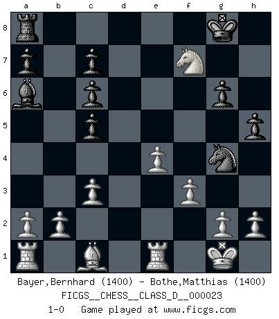 Last move : 1-0 2007 January 5 0:26:54 [Event "FICGS__CHESS__CLASS_D__000023"] [Site "FICGS"] [Date "2006.12.24"] [Round "1"] [White "Bayer,Bernhard"] [Black "Bothe,Matthias"] [Result "1-0"] [WhiteElo "1400"] [BlackElo "1400"] 1.e4 e5 2.Nf3 Nc6 3.Bb5 Nf6 4.O-O Bc5 5.c3 O-O 6.d4 d6 7.dxc5 dxc5 8.Bxc6 bxc6 9.Qxd8 Rxd8 10.Nbd2 Ba6 11.Re1 g6 12.Nxe5 Rd6 13.Ndf3 h5 14.Ng5 Ng4 15.Nexf7 Rf6 16.f3 Rxf7 17.Nxf7 1-0 Ruy Lopez : Berlin defense, Beverwijk variation Kingside Castling by player White (move 4) Kingside Castling by player Black (move 5) Player White won this chess game. Follow this game move after move (download)Methodical thinking is of more use in Chess than inspiration. (C. J. S. Purdy) Schon mancher Spieler hat aufgegeben, um zu vermeiden, daß er eine Figur verliert. (Savielly Grigorievitsch Tartakower) El jugador táctico sabe que hacer cuando hay algo que hacer; mientras que el estratega sabe que hacer cuando no hay nada que hacer. (Gerald Abrahams) 'L'échange des dames est un coup dur pour les deux adversaires...' Un journaliste lors d'une partie du match Spassky-Fischer Think like a man of action, act like a man of thought. (Henri Louis Bergson)