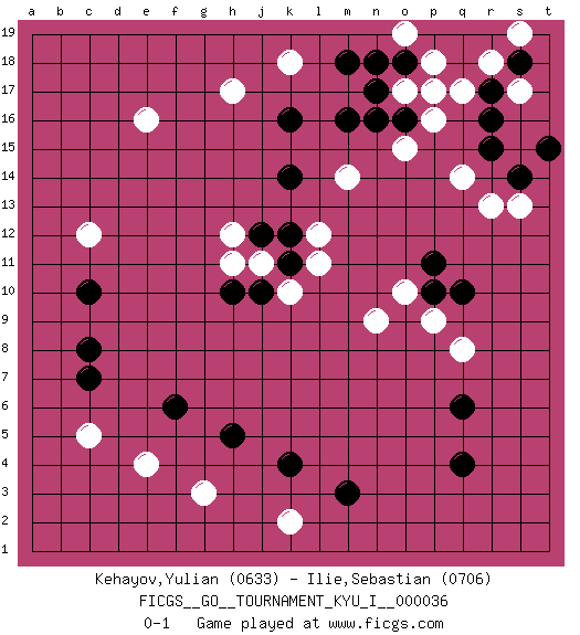 Last move : 0-1 2011 October 17 12:11:14 [Event "FICGS__GO__TOURNAMENT_KYU_I__000036"] [Site "FICGS"] [Date "2011.06.14"] [Round "1"] [Black "Kehayov,Yulian"] [White "Ilie,Sebastian"] [Result "0-1"] [Rating 1 "0633"] [Rating 2 "0706"] 1.r15 e16 2.q4 e4 3.q10 p16 4.c10 c12 5.c8 c5 6.c7 r13 7.r17 q14 8.k4 q8 9.q6 p9 10.p10 n9 11.k16 h17 12.m16 k18 13.m18 o17 14.o18 p18 15.n17 o19 16.n18 q17 17.r16 r18 18.s18 s19 19.o16 p17 20.s14 s13 21.t15 s17 22.f6 g3 23.h5 k2 24.m3 o10 25.p11 o15 26.n16 m14 27.k14 l12 28.k12 l11 29.k11 k10 30.j10 j11 31.j12 h11 32.h10 h12 0-1 This go game has been lost on time (started : 2011.06.14 23:3:51) Here are the names of the openings (joseki) played in the four corners : Corner q16 : r15 p16 Mokuhazushi (Waemok, Wai`mu`) 5-3 Point. The mokuhazushi (5-3) point was popular in the Edo period in Japan (1600 - 1867). It emphasizes influence; territorially, it is inferior to the 3-4 point. Takamoku Kakari. White prevents Black from gaining influence, but in the local context, abandoning profit in the corner entails a loss. Black 3-4 and 4-4 are best. Corner d4 : e4 c8 Takamoku (Gomok, Gaomu`) 5-4 Point. The takamoku (high) point (5-4). With its emphasis on influence, the 5-4 point complements the 4-4 (hoshi) point in creating an influence-oriented fuseki. Corner q4 : q4 q8 Hoshi (Hwajeom, Seongjeom, Xingwei`) 4-4 Point. The star or hoshi (4-4) point, emphasizing influence at the potential expense of territory. Player White won this Go (weiqi, baduk) game. Follow this game move after move (download)Extend one hand from the cutting points. (Anonymous) For peace of mind, resign as general manager of the universe. (Douglas Adams)