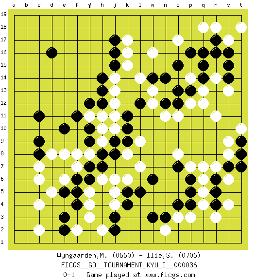 Last move : 0-1 2011 December 1 15:38:21 [Event "FICGS__GO__TOURNAMENT_KYU_I__000036"] [Site "FICGS"] [Date "2011.06.14"] [Round "1"] [Black "Wyngaarden,Martin"] [White "Ilie,Sebastian"] [Result "0-1"] [Rating 1 "0660"] [Rating 2 "0706"] 1.d16 c4 2.q16 q4 3.c11 r14 4.o15 k16 5.k5 o17 6.r16 r11 7.p4 p3 8.o4 q5 9.j17 k17 10.e3 g3 11.f4 g4 12.d6 d5 13.e5 c6 14.d7 c7 15.c8 d8 16.c9 e8 17.e7 f7 18.f6 e6 19.g6 g5 20.f5 h6 21.g7 g8 22.h7 j6 23.h8 k6 24.l5 k8 25.g9 f8 26.m6 q7 27.j16 k15 28.j15 q18 29.h12 j14 30.h14 j13 31.h13 h9 32.j9 h10 33.j8 l7 34.g10 j10 35.k9 l9 36.k10 j11 37.k11 j12 38.j3 j4 39.k4 j5 40.l12 l14 41.m14 m16 42.q14 q13 43.p13 q12 44.s15 s17 45.p16 n11 46.n12 o11 47.o12 p14 48.q15 p12 49.o13 m13 50.n14 m12 51.s14 s13 52.r17 r18 53.s16 t18 54.e10 g11 55.f11 h11 56.g12 h2 57.j2 f2 58.e2 c2 59.p6 q6 60.p5 o3 61.n3 n2 62.m3 p7 63.o7 o8 64.r4 r3 65.r5 s4 66.r6 r7 67.s7 s8 68.t8 s9 69.t9 t10 70.t7 s6 0-1 Here are the names of the openings (joseki) played in the four corners : Corner q16 : q16 r14 Hoshi (Hwajeom, Seongjeom, Xingwei`) 4-4 Point. The star or hoshi (4-4) point, emphasizing influence at the potential expense of territory. Ikken Kakari (Hankan Keolch'im, Yi Gua`jiao~, 1-Space Low Approach). White 2 is the standard approach move to the 4-4. Corner q4 : q4 p4 Hoshi (Hwajeom, Seongjeom, Xingwei`) 4-4 Point. The star or hoshi (4-4) point, emphasizing influence at the potential expense of territory. Corner d4 : c4 e3 Komoku (Somok, Xiao~mu`) 3-4 Point. The komoku (3-4) point is the traditional corner enclosure move.. Ikken Kakari (Hankan Keolch'im, Yi Gua`jiao~, 1-Space Low Pincer). The small knight move is the basic approach move to the 3-4 point stone. It has been continually used for over four centuries. There are limitless variations, with new moves constantly being discovered. Black 2 opens the door to a treaure store of joseki. Player White won this Go (weiqi, baduk) game. Follow this game move after move (download)While the Baroque rules of chess could only have been created by humans, the rules of go are so elegant, organic, and rigorously logical that if intelligent life forms exist elsewhere in the universe, they almost certainly play go. (Edward Lasker, international chess master) He is a liar. I just don't know what the lie is yet. (Horatio Caine, C.S.I. Miami)