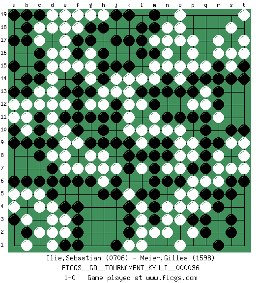 Last move : 1-0 2011 October 29 21:34:16 [Event "FICGS__GO__TOURNAMENT_KYU_I__000036"] [Site "FICGS"] [Date "2011.06.14"] [Round "1"] [Black "Ilie,Sebastian"] [White "Meier,Gilles"] [Result "1-0"] [Rating 1 "0706"] [Rating 2 "1598"] 1.q16 d4 2.q3 d16 3.r9 o17 4.q14 n3 5.k4 l2 6.f3 e3 7.f4 q4 8.r4 p4 9.p3 o4 10.r5 r17 11.q17 r16 12.r15 q18 13.p18 s18 14.q19 r19 15.r18 s15 16.s14 q18 17.p19 s16 18.r18 p15 19.s19 t19 20.t18 t17 21.s17 q15 22.r14 s18 23.r19 p17 24.s17 p16 25.q18 s18 26.c6 t19 27.t15 o18 28.t18 r3 29.s3 t19 30.f17 o19 31.j17 e17 32.f16 c13 33.c10 c5 34.d6 b5 35.b6 e2 36.f2 k10 37.h10 k12 38.k9 l9 39.j9 m10 40.l8 m8 41.m7 l7 42.k8 n7 43.m6 o8 44.n9 o10 45.m9 l10 46.n8 o9 47.n6 o7 48.o6 p6 49.c15 d15 50.c14 d14 51.b13 b12 52.b14 d12 53.b17 c17 54.b18 c18 55.c16 e18 56.e13 d13 57.c11 c12 58.f14 e12 59.f12 b10 60.b9 b11 61.d9 f11 62.g11 g12 63.f13 g10 64.h11 e10 65.g9 f9 66.f10 e9 67.e11 d11 68.f11 d10 69.c9 a12 70.a10 f18 71.g18 b19 72.a15 g19 73.h18 e16 74.d19 d18 75.c19 e19 76.c19 a18 77.a19 e7 78.e6 f7 79.f6 g7 80.h5 d8 81.c8 g8 82.o13 m14 83.n14 n15 84.m13 o14 85.n13 l14 86.l13 k13 87.l16 m15 88.k15 k14 89.p14 o15 90.q11 r7 91.q7 q6 92.q8 r2 93.s2 r6 94.p7 n10 95.m8 h13 96.h15 k18 97.l18 j18 98.k17 h19 99.k19 f15 100.j19 g16 101.g17 g15 102.h16 g14 103.g13 h12 104.h14 e15 105.j11 k11 106.c3 c2 107.b2 d2 108.b4 a4 109.a3 a5 110.e1 d1 111.f1 b1 112.e4 c4 113.d5 d3 114.k2 l3 115.k3 r8 116.q10 p12 117.p13 q12 118.r12 q13 119.r13 o3 120.q2 p2 121.r1 o1 122.o11 l4 123.l5 k1 124.j1 l1 125.m4 n2 126.m3 m2 127.j6 j7 128.k7 h6 129.g6 h7 130.d7 e8 131.s6 s7 132.s5 b19 133.a17 d19 134.a19 p9 135.q9 a18 136.a13 s9 137.s10 t8 138.t10 t9 139.t6 t7 140.n11 m11 141.m12 m17 142.m16 n16 143.m18 n18 144.m19 j14 145.j15 n4 146.m5 t16 147.t14 k5 148.j5 o5 149.q5 p5 150.j12 j13 151.a19 a11 152.a6 b3 153.a9 l12 154.c19 h8 155.h9 p8 156.b19 r11 157.p11 f19 158.l17 n17 159.pass 1-0 Here are the names of the openings (joseki) played in the four corners : Corner q16 : q16 o17 Hoshi (Hwajeom, Seongjeom, Xingwei`) 4-4 Point. The star or hoshi (4-4) point, emphasizing influence at the potential expense of territory. Ikken Kakari (Hankan Keolch'im, Yi Gua`jiao~, 1-Space Low Approach). White 2 is the standard approach move to the 4-4. Corner d4 : d4 f3 Hoshi (Hwajeom, Seongjeom, Xingwei`) 4-4 Point. The star or hoshi (4-4) point, emphasizing influence at the potential expense of territory. Ikken Kakari (Hankan Keolch'im, Yi Gua`jiao~, 1-Space Low Approach). Black 2 is the standard approach move to the 4-4. Corner d16 : d16 f17 Hoshi (Hwajeom, Seongjeom, Xingwei`) 4-4 Point. The star or hoshi (4-4) point, emphasizing influence at the potential expense of territory. Ikken Kakari (Hankan Keolch'im, Yi Gua`jiao~, 1-Space Low Approach). Black 2 is the standard approach move to the 4-4. Player Black won this Go (weiqi, baduk) game. Follow this game move after move (download)A meijin needs no joseki. (Anonymous) I've lost money so fast in these clubs it's left me reeling. I've read every poker book ever written, but the only way to get better at the game is to go out and play with people who are really good. The problem is, you stand to lose a lot of money doing it. (Matt Damon)