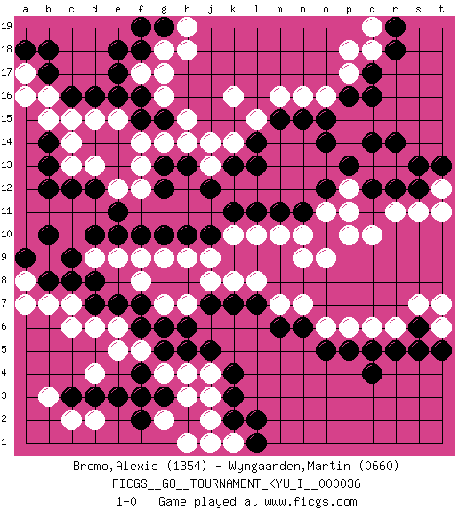 Last move : 1-0 2012 January 16 0:19:56 [Event "FICGS__GO__TOURNAMENT_KYU_I__000036"] [Site "FICGS"] [Date "2011.06.14"] [Round "1"] [Black "Bromo,Alexis"] [White "Wyngaarden,Martin"] [Result "1-0"] [Rating 1 "1354"] [Rating 2 "0660"] 1.q16 d4 2.q4 f17 3.d16 e15 4.e16 d15 5.f16 g17 6.e17 k16 7.k4 q10 8.d10 d9 9.f6 e6 10.o14 r6 11.r5 q13 12.r14 r13 13.q14 p6 14.p5 q6 15.q5 n9 16.o10 o9 17.n6 o6 18.o5 n7 19.m6 p17 20.q17 o16 21.n15 n16 22.o15 m16 23.m15 l15 24.l14 f12 25.e11 e12 26.d12 d13 27.c12 j3 28.k3 j4 29.k2 j2 30.j5 h4 31.h5 f5 32.g5 g4 33.e7 d6 34.d7 c7 35.c9 e9 36.e10 f9 37.f10 g9 38.g10 h9 39.h10 j9 40.j10 k10 41.k11 l10 42.l11 m10 43.m11 m7 44.l7 l8 45.k7 k8 46.j7 h14 47.h13 g16 48.f15 p10 49.p13 p12 50.o12 o11 51.n11 n10 52.q12 p11 53.r12 r11 54.s13 s11 55.s12 c13 56.b13 c14 57.b14 b15 58.b12 f14 59.g15 h15 60.c16 b16 61.b17 c15 62.f18 g18 63.g19 h19 64.f19 h18 65.e18 q18 66.r18 q19 67.r19 p18 68.p16 k14 69.k13 g14 70.g13 f13 71.g12 j13 72.j12 j14 73.l13 t12 74.t13 t11 75.s6 s7 76.s5 t6 77.t5 t7 78.c8 b7 79.b8 a8 80.a9 a7 81.b10 k1 82.l1 j1 83.l2 h7 84.h6 g7 85.f7 j8 86.g6 f8 87.d8 a17 88.a18 a16 89.b18 c6 90.c3 c2 91.d3 d2 92.e3 b3 93.f4 e5 94.g3 g2 95.h2 h1 96.f2 h3 97.f3 1-0 Here are the names of the openings (joseki) played in the four corners : Corner d16 : f17 d16 Oomokuhazushi 6-3 Point. The large mokuhazushi point (6-3), a remnant of the "new fuseki" movement in Japan in the 1930's. As an initial corner point, its popular usage has not stood the test of time. Hoshi. White continues with 3-6. Corner q4 : q4 r6 Hoshi (Hwajeom, Seongjeom, Xingwei`) 4-4 Point. The star or hoshi (4-4) point, emphasizing influence at the potential expense of territory. Ikken Kakari (Hankan Keolch'im, Yi Gua`jiao~, 1-Space Low Approach). White 2 is the standard approach move to the 4-4. Player Black won this Go (weiqi, baduk) game. Follow this game move after move (download)Don't disturb symmetry. (Anonymous) Programmer - an organism that turns coffee into software. (Anonymous)