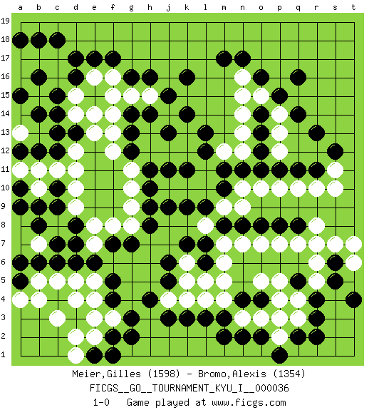 Last move : 1-0 2011 October 24 21:32:1 [Event "FICGS__GO__TOURNAMENT_KYU_I__000036"] [Site "FICGS"] [Date "2011.06.14"] [Round "1"] [Black "Meier,Gilles"] [White "Bromo,Alexis"] [Result "1-0"] [Rating 1 "1598"] [Rating 2 "1354"] 1.q16 d4 2.d16 q4 3.c6 c5 4.d6 d5 5.e6 e5 6.g3 f3 7.f4 e4 8.f2 e3 9.f5 e2 10.g2 q10 11.k16 k4 12.h4 d10 13.c13 d12 14.c12 c11 15.r3 q3 16.r4 r5 17.s5 r6 18.s6 r7 19.q2 p2 20.r2 s7 21.t4 t6 22.o2 o3 23.p1 p3 24.n2 n3 25.r13 p13 26.n17 o15 27.o16 f14 28.g16 h15 29.h16 g15 30.j15 j14 31.k14 k13 32.l13 k12 33.l12 f16 34.f17 e16 35.e17 d15 36.c15 d14 37.c14 l11 38.m11 n10 39.k11 l10 40.j13 j12 41.h14 h13 42.g14 f15 43.g13 h12 44.g12 f12 45.h11 j14 46.j11 g11 47.j13 f13 48.m10 m9 49.l9 k10 50.k9 j10 51.h9 m12 52.n11 n12 53.o11 o10 54.j9 g10 55.h10 g9 56.o12 n13 57.o13 n14 58.o14 n15 59.p15 p14 60.q14 p12 61.p11 p10 62.q11 r10 63.m8 n9 64.m3 m4 65.l3 l4 66.k3 j4 67.b6 b5 68.b9 b10 69.c9 d9 70.d8 e8 71.d7 e7 72.f7 f8 73.g7 g8 74.h8 l8 75.l7 m7 76.n8 n7 77.o8 o7 78.p8 p7 79.q8 q7 80.l6 m6 81.j6 l5 82.j3 k6 83.k7 k5 84.j5 r8 85.r11 s11 86.s12 s10 87.d13 e13 88.b12 b11 89.e1 d1 90.f1 d2 91.a5 a4 92.a6 b4 93.c10 d11 94.a12 c3 95.a10 a11 96.a9 c16 97.d17 c17 98.b16 b17 99.b14 a16 100.a15 b15 101.n4 m5 102.b16 a17 103.c18 b15 104.q5 p5 105.b16 a13 106.b18 b15 107.e15 e14 108.b16 c8 109.b8 b7 110.c7 b15 111.o4 p4 112.b16 o5 113.a18 n16 114.m17 t7 115.m2 1-0 Here are the names of the openings (joseki) played in the four corners : Corner d4 : d4 c6 Hoshi (Hwajeom, Seongjeom, Xingwei`) 4-4 Point. The star or hoshi (4-4) point, emphasizing influence at the potential expense of territory. Ikken Kakari (Hankan Keolch'im, Yi Gua`jiao~, 1-Space Low Approach). Black 2 is the standard approach move to the 4-4. Corner q4 : q4 r3 Hoshi (Hwajeom, Seongjeom, Xingwei`) 4-4 Point. The star or hoshi (4-4) point, emphasizing influence at the potential expense of territory. Player Black won this Go (weiqi, baduk) game. Follow this game move after move (download)A knight's move near the edge of the board cannot be cut. (Bill Taylor) Now the reason the enlightened prince and the wise general conquer the enemy whenever they move and their achievements surpass those of ordinary men is foreknowledge. (Sun Tzu)