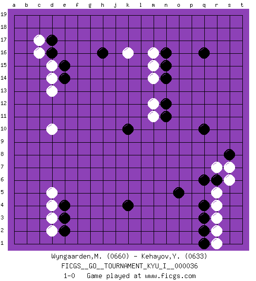 Last move : 1-0 2011 October 16 0:0:43 [Event "FICGS__GO__TOURNAMENT_KYU_I__000036 "] [Site "FICGS"] [Date "2011.06.14"] [Round "1"] [Black "Wyngaarden,Martin "] [White "Kehayov,Yulian "] [Result "1-0"] [Rating 1 "0660"] [Rating 2 "0633"] 1.d16 r5 2.q16 d5 3.q10 k16 4.k4 d10 5.q4 r4 6.q3 r3 7.q2 r2 8.q1 r1 9.o5 c17 10.d17 c16 11.e4 d3 12.e3 d4 13.e2 d2 14.r6 s6 15.s8 r7 16.q6 s7 17.k10 d14 18.e15 d15 19.e14 d13 20.h16 m16 21.n16 m15 22.n15 m14 23.n14 m12 24.n12 m11 25.n11 1-0 This go game has been lost on time (started : 2011.06.14 23:3:51) Here are the names of the openings (joseki) played in the four corners : Corner q4 : r5 q4Mokuhazushi (Waemok, Wai`mu`) 5-3 Point. The mokuhazushi (5-3) point was popular in the Edo period in Japan (1600 - 1867). It emphasizes influence; territorially, it is inferior to the 3-4 point. Corner d16 : d16 c17Hoshi (Hwajeom, Seongjeom, Xingwei`) 4-4 Point. The star or hoshi (4-4) point, emphasizing influence at the potential expense of territory. Corner d4 : d5 e4Takamoku (Gomok, Gaomu`) 5-4 Point. The takamoku (high) point (5-4). With its emphasis on influence, the 5-4 point complements the 4-4 (hoshi) point in creating an influence-oriented fuseki. Corner q16 : q16 m16Hoshi (Hwajeom, Seongjeom, Xingwei`) 4-4 Point. The star or hoshi (4-4) point, emphasizing influence at the potential expense of territory. Player Black won this Go (weiqi, baduk) game.Follow this game move after move (download ) A few moments to learn, a lifetime to master. (Ancient proverb) The obstacle is the path. (Zen proverb)