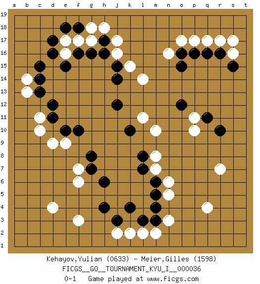 Last move : 0-1 2011 October 27 0:48:55 [Event "FICGS__GO__TOURNAMENT_KYU_I__000036"] [Site "FICGS"] [Date "2011.06.14"] [Round "1"] [Black "Kehayov,Yulian"] [White "Meier,Gilles"] [Result "0-1"] [Rating 1 "0633"] [Rating 2 "1598"] 1.c15 q4 2.q16 d4 3.r10 c10 4.d16 o17 5.k4 n3 6.h4 f3 7.m4 r17 8.r16 q17 9.o16 n16 10.o15 s16 11.s15 s17 12.p16 p17 13.g16 r7 14.e10 d9 15.d11 c11 16.d12 e9 17.f10 j17 18.g8 f7 19.g7 f6 20.h6 m10 21.k10 l11 22.j12 l14 23.j14 k15 24.j15 j16 25.h16 j2 26.j3 k2 27.l3 l2 28.m3 m2 29.l8 m8 30.l7 m7 31.m6 n6 32.m5 n5 33.o12 g18 34.f18 f17 35.e18 g17 36.h17 h18 37.f16 e17 38.d17 e16 39.e15 b13 40.c13 b14 41.c14 p10 42.q11 p11 0-1 This go game has been lost on time (started : 2011.06.14 23:3:51) Here are the names of the openings (joseki) played in the four corners : Corner q16 : q16 o17 Hoshi (Hwajeom, Seongjeom, Xingwei`) 4-4 Point. The star or hoshi (4-4) point, emphasizing influence at the potential expense of territory. Ikken Kakari (Hankan Keolch'im, Yi Gua`jiao~, 1-Space Low Approach). White 2 is the standard approach move to the 4-4. Corner d4 : d4 h4 Hoshi (Hwajeom, Seongjeom, Xingwei`) 4-4 Point. The star or hoshi (4-4) point, emphasizing influence at the potential expense of territory. Player White won this Go (weiqi, baduk) game. Follow this game move after move (download)Big groups never die. (Anonymous) As a goal marker shodan is important. As a destination it is a poor place to stop. (Thomas Tamayo)