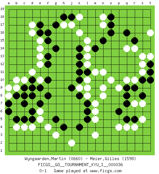 Last move : 0-1 2011 November 4 14:21:19 [Event "FICGS__GO__TOURNAMENT_KYU_I__000036"] [Site "FICGS"] [Date "2011.06.14"] [Round "1"] [Black "Wyngaarden,Martin"] [White "Meier,Gilles"] [Result "0-1"] [Rating 1 "0660"] [Rating 2 "1598"] 1.r5 d16 2.q16 q4 3.q5 p4 4.p6 d4 5.e17 d17 6.e16 e15 7.f16 e13 8.g14 r14 9.r15 q14 10.o16 q10 11.k4 g3 12.g5 d7 13.h4 j2 14.m14 m3 15.r9 r10 16.q9 r4 17.f8 j17 18.j18 k18 19.h18 n18 20.o18 n17 21.o17 h17 22.g17 k16 23.f13 e12 24.f15 e14 25.f12 p9 26.q8 o10 27.k14 l15 28.n10 n11 29.m10 n9 30.m9 n8 31.m8 m5 32.l6 m7 33.l7 m6 34.l5 m11 35.l11 l12 36.k12 l10 37.k11 l8 38.k10 l9 39.k8 k9 40.j9 l13 41.k13 l14 42.d10 d11 43.c9 e10 44.e9 c10 45.d9 b10 46.f10 s7 47.s8 r7 48.q7 s5 49.s10 s11 50.t11 s12 51.t12 t13 52.t10 s13 53.d5 e5 54.d6 e6 55.c7 c6 56.c5 b6 57.e7 c4 58.b5 b7 59.d8 b9 60.b8 a8 61.c8 b4 62.a6 a9 63.a7 f4 64.n15 t16 0-1 Here are the names of the openings (joseki) played in the four corners : Corner q4 : r5 q4 Mokuhazushi (Waemok, Wai`mu`) 5-3 Point. The mokuhazushi (5-3) point was popular in the Edo period in Japan (1600 - 1867). It emphasizes influence; territorially, it is inferior to the 3-4 point. Corner d16 : d16 e17 Hoshi (Hwajeom, Seongjeom, Xingwei`) 4-4 Point. The star or hoshi (4-4) point, emphasizing influence at the potential expense of territory. Corner q16 : q16 r14 Hoshi (Hwajeom, Seongjeom, Xingwei`) 4-4 Point. The star or hoshi (4-4) point, emphasizing influence at the potential expense of territory. Ikken Kakari (Hankan Keolch'im, Yi Gua`jiao~, 1-Space Low Approach). White 2 is the standard approach move to the 4-4. Player White won this Go (weiqi, baduk) game. Follow this game move after move (download)Sacrifice for shape. (Anonymous) Internet: Absolute communication, absolute isolation. (Paul Carvel)