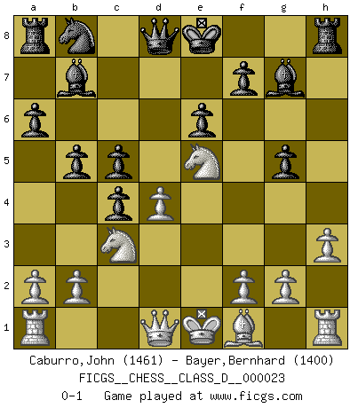 Last move : 0-1 2007 January 7 13:1:57 [Event "FICGS__CHESS__CLASS_D__000023"] [Site "FICGS"] [Date "2006.12.24"] [Round "1"] [White "Caburro,John"] [Black "Bayer,Bernhard"] [Result "0-1"] [WhiteElo "1461"] [BlackElo "1400"] 1.d4 Nf6 2.c4 e6 3.Nf3 d5 4.Bg5 dxc4 5.e4 b5 6.e5 h6 7.exf6 hxg5 8.fxg7 Bxg7 9.Nc3 a6 10.Ne5 Bb7 11.h3 c5 0-1 Queen's pawn game Player Black won this chess game. Follow this game move after move (download)No one ever won a game by resigning. (Unknown) Wenn man heute mit 14 Jahren noch kein GM ist, kann man es vergessen. (Viswanathan Anand) No existe un remordimiento como el remordimiento del Ajedrez. (H. G. Wells) Les sacrifices démontrent seulement que quelqu'un a gaffé. (Savielly Tartacover) Those who make the worst use of their time are the first to complain of its brevity. (Jean de la Bruyere)