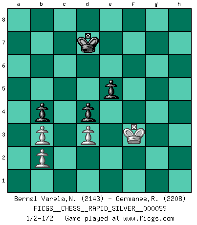 Last move : 1/2-1/2 2012 March 11 5:45:7 [Event "FICGS__CHESS__RAPID_SILVER__000059"] [Site "FICGS"] [Date "2011.06.17"] [Round "1"] [White "Bernal Varela,Nelson"] [Black "Germanes,Ramil"] [Result "1/2-1/2"] [WhiteElo "2143"] [BlackElo "2208"] 1.e4 e5 2.Nf3 Nc6 3.Bb5 a6 4.Ba4 Nf6 5.O-O Be7 6.Re1 b5 7.Bb3 O-O 8.Nc3 d6 9.Nd5 Na5 10.Nxe7+ Qxe7 11.d3 c5 12.Bd2 Nc6 13.Bg5 Be6 14.c3 h6 15.Bh4 Bxb3 16.axb3 Rfd8 17.Nd2 Qe6 18.Qf3 g5 19.Bg3 Kg7 20.h4 Qg4 21.Qxg4 Nxg4 22.Nf1 Nf6 23.f3 Nh5 24.Bf2 Nf4 25.Red1 Ne7 26.Ne3 a5 27.Kf1 Ne6 28.Ra2 b4 29.Rda1 Rdb8 30.c4 Nc6 31.Nf5+ Kg6 32.Be3 Rh8 33.Ke2 Nf4+ 34.Bxf4 gxf4 35.Rg1 Kf6 36.Kf1 Rag8 37.Kf2 Ke6 38.R2a1 Rg6 39.Ra2 Rhg8 40.R2a1 h5 41.Ra4 Ra8 42.Rga1 Kd7 43.Rg1 Rf8 44.R4a1 Rfg8 45.Ra4 Kc7 46.R4a1 Kb6 47.Raf1 Nd4 48.Nxd4 cxd4 49.Ra1 Rg3 50.Ra4 f6 51.R4a1 Rf8 52.Ra4 Rc8 53.Rh1 Rg7 54.Rg1 Rcg8 55.R4a1 Rg3 56.Ra4 R3g6 57.R4a1 R8g7 58.Rae1 Rg3 59.Ra1 Rf7 60.Ra4 Rg8 61.g4 Rfg7 62.Rga1 hxg4 63.Rxa5 gxf3 64.c5+ Kc7 65.Ra7+ Kc8 66.Ra8+ Kd7 67.R8a7+ Ke6 68.Rxg7 Rxg7 69.c6 Rg2+ 70.Kxf3 Rc2 71.h5 Rxc6 72.Ra7 Rc8 73.h6 Rg8 74.Kf2 Rg5 75.h7 Rh5 76.Kf3 Rh4 77.Rc7 f5 78.exf5+ Kxf5 79.Rd7 Rh2 80.Rg7 Rh3+ 81.Kg2 Rh6 82.Kf3 Rh2 83.Rd7 Rh3+ 84.Kg2 Rh5 85.Kf3 Rh1 86.Kg2 Rh6 87.Kf3 Kg6 88.Kg4 Rh2 89.h8Q Rxh8 90.Rxd6+ Kf7 91.Kf5 f3 92.Rf6+ Ke7 93.Re6+ Kd7 94.Rf6 Rh5+ 95.Ke4 Ke7 96.Rxf3 Ke6 97.Rf8 Rh4+ 98.Kf3 Rh3+ 99.Ke2 Rh2+ 100.Rf2 Rxf2+ 101.Kxf2 Kf5 102.Kf1 Kf4 103.Kf2 Kg4 104.Kg2 Kh4 105.Kf3 Kg5 106.Kg3 Kf6 107.Kg2 Ke7 108.Kf3 Kd7 1/2-1/2 Ruy Lopez : Closed, 7...O-O Kingside Castling by player White (move 5) Kingside Castling by player Black (move 7) Promotion Queen by player White (move 89) 10 pieces endgame at move 96 : White KRPPP , Black KRPPP WHITE : King + 1 Rook 3 Pawns BLACK : King + 1 Rook 3 Pawns 9 pieces endgame at move 100 : White KPPP , Black KRPPP WHITE : King + 3 Pawns BLACK : King + 1 Rook 3 Pawns 8 pieces endgame at move 101 : White KPPP , Black KPPP WHITE : King + 3 Pawns BLACK : King + 3 Pawns This chess game ended in a draw. Follow this game move after move (download)I like the moment when I break a man's ego. (Bobby Fischer) Jeder weiß, dass Gasprom Putins persönliches Machtinstrument ist. Die Firma wird vom Kreml aus geleitet und wird schon deshalb nie transparent sein. (Garry Kasparov) De eso se trata el Ajedrez. Un día le das una lección a tu oponente y al día siguiente el te da una a tí. (Bobby Fischer) Avec des compensations pour le matériel en plus... (Anonyme) Ah, beer! The cause of, and the solution to, all of life's problems. (Homer Simpson)