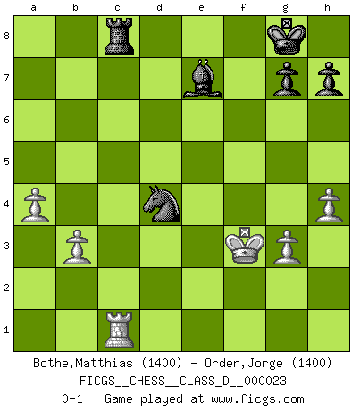 Last move : 0-1 2007 March 6 14:13:27 [Event "FICGS__CHESS__CLASS_D__000023"] [Site "FICGS"] [Date "2006.12.24"] [Round "1"] [White "Bothe,Matthias"] [Black "Orden,Jorge"] [Result "0-1"] [WhiteElo "1400"] [BlackElo "1400"] 1.e4 c5 2.Bc4 d6 3.d3 Nc6 4.Be3 Nf6 5.Nc3 e6 6.Nf3 Be7 7.O-O O-O 8.b3 a6 9.g3 b5 10.Bxb5 axb5 11.Nxb5 Ng4 12.h3 Nxe3 13.fxe3 Bb7 14.c4 Nb4 15.h4 f5 16.exf5 Rxf5 17.e4 Rf6 18.a3 Na6 19.a4 Nb4 20.Kg2 d5 21.exd5 exd5 22.cxd5 Bxd5 23.d4 Bxf3+ 24.Rxf3 Rxf3 25.Qxf3 Qd5 26.Nc7 Qxf3+ 27.Kxf3 Rc8 28.Nb5 cxd4 29.Nxd4 Nc2 30.Rc1 Nxd4+ 0-1 Sicilian defense Kingside Castling by player White (move 7) Kingside Castling by player Black (move 7) Player Black won this chess game. Follow this game move after move (download)The way he plays Chess demonstrates a man's whole nature. (Stanley Ellin) Ich verachte die Medien. (Robert James Fischer) Estaba muy claro de que el punto vulnerable del Gran Maestro Americano (Bobby Fischer) radicaba en las posiciones de doble filo, colgantes, irracionales, donde el siempre falló en encontrar un triunfo aún en una posición de clara victoria. (Efim Geller) On n'a jamais que l'âge auquel on a commence à jouer aux échecs car après on cesse de vieillir. (Capablanca) I think your argument is specious - I think your tie is ugly. (Gregory House to Dr. Foreman, House M.D.)