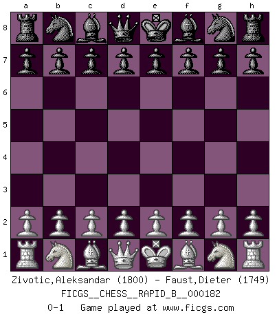 Last move : 0-1 2011 July 18 20:26:20 [Event "FICGS__CHESS__RAPID_B__000182"] [Site "FICGS"] [Date "2011.06.18"] [Round "1"] [White "Zivotic,Aleksandar"] [Black "Faust,Dieter"] [Result "0-1"] [WhiteElo "1800"] [BlackElo "1749"] 0-1 This chess game has been lost on time (started : 2011.06.18 9:3:1) Player Black won this chess game. Follow this game move after move (download)I have added these principles to the law: get the Knights into action before both Bishops are developed. (Emanuel Lasker) Als ich elf wurde, wurde ich einfach gut. (Robert James Fischer) Fischer es el jugador mas fuerte del mundo. De hecho, el jugador mas fuerte que jamas haya existido. (Larry Evans) Même si vous avez un bon coup à faire, regardez toujours s'il n'y en a pas un qui lui soit préférable. (Pedro Damiano) Success without honor is an unseasoned dish; it will satisfy your hunger, but it won't taste good. (Joe Paterno)