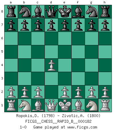 Last move : 1-0 2011 July 18 20:26:20 [Event "FICGS__CHESS__RAPID_B__000182"] [Site "FICGS"] [Date "2011.06.18"] [Round "1"] [White "Ropokis,Dimitrios"] [Black "Zivotic,Aleksandar"] [Result "1-0"] [WhiteElo "1798"] [BlackElo "1800"] 1.d4 1-0 This chess game has been lost on time (started : 2011.06.18 9:3:1) Queen's pawn Player White won this chess game. Follow this game move after move (download)Chess, like any creative activity, can exist only through the combined efforts of those who have creative talent, and those who have the ability to organize their creative work. (Mikhail Botvinnik) Frage des Reporters: -Welche besonderen Umstände rechtfertigen das Anhalten der Uhren während einer Turnierpartie? Antwort: -Einen Fotographen zu strangulieren. (Siegbert Tarrasch) Cuando tengo las piezas blancas, yo gano porque soy blanco; Cuando tengo las piezas negras, yo gano porque soy Bogolyubov. (Bogolyubov) La guerre est enfant de la passion, la passion est enfant du narcissisme et le narcissisme est l'enfant. (...) Une autre partie ? (Thibault de Vassal) True nature is revealed in times of difficulty. (Chinese proverb)