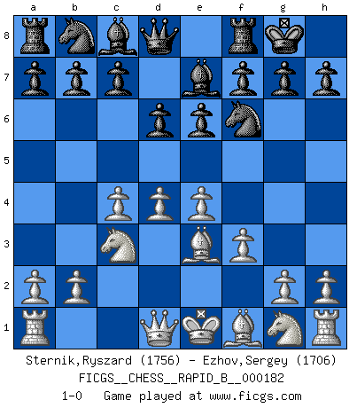 Last move : 1-0 2011 July 26 8:45:16 [Event "FICGS__CHESS__RAPID_B__000182"] [Site "FICGS"] [Date "2011.06.18"] [Round "1"] [White "Sternik,Ryszard"] [Black "Ezhov,Sergey"] [Result "1-0"] [WhiteElo "1756"] [BlackElo "1706"] 1.e4 d6 2.d4 Nf6 3.f3 e6 4.c4 Be7 5.Nc3 O-O 6.Be3 1-0 This chess game has been lost on time (started : 2011.06.18 9:3:1) King's pawn Opening Kingside Castling by player Black (move 5) Player White won this chess game. Follow this game move after move (download)Nothing excites jaded Grandmasters more than a theoretical novelty. (Dominic Lawson) Wer wird heute Abend ihr Gegner sein? -- Heute Abend spiele ich gegen die schwarzen Steine. (Akiba Rubinstein) El Ajedrez es como la guerra en un tablero. (Bobby Fischer) Assurément je connaissais par expérience le mystérieux attrait de ce jeu royal, le seul entre tous les jeux inventés par les hommes qui échappe souverainement à la tyrannie du hasard, le seul où l'on ne doive sa victoire qu'à son intelligence ou plutôt à une certaine forme d'intelligence. Mais n'est-ce pas déjà le limiter injurieusement que d'appeler les échecs un jeu ? N'est-ce pas une science, un art ou quelque chose qui, comme le cercueil de Mahomet entre ciel et terre, est suspendu entre l'un et l'autre, et qui réunit un nombre incroyable de contraires ? [...] C'est une pensée qui ne mène à rien, une mathématique qui n'établit rien, un art qui ne laisse pas d'uvre, une architecture sans matière; et il l'a prouvé néanmoins qu'il était plus durable, à sa manière, que les livres ou que tout autre monument, ce jeu unique qui appartient à tous les peuples et à tous les temps, et dont personne ne sait quel dieu en fit don à la terre pour tuer l'ennui, pour aiguiser l'esprit et stimuler l'âme. Où commence-t-il, où finit-il ? (Stefan Zweig) You must do what you feel is right... of course. (Obi-Wan Kenobi in Star Wars ep.4)