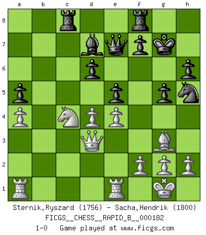Last move : 1-0 2011 August 20 21:53:8 [Event "FICGS__CHESS__RAPID_B__000182"] [Site "FICGS"] [Date "2011.06.18"] [Round "1"] [White "Sternik,Ryszard"] [Black "Sacha,Hendrik"] [Result "1-0"] [WhiteElo "1756"] [BlackElo "1800"] 1.e4 e5 2.Nf3 Nc6 3.Nc3 Nf6 4.Bb5 Bb4 5.O-O O-O 6.d3 d6 7.Bg5 Bxc3 8.bxc3 h6 9.Bh4 Bd7 10.Nd2 a6 11.Ba4 b5 12.Bb3 Qe7 13.a3 Na5 14.Qf3 Nxb3 15.cxb3 g5 16.Bg3 Kg7 17.d4 a5 18.Rfe1 c5 19.a4 cxd4 20.cxd4 bxa4 21.bxa4 Rac8 22.Qd3 Nh5 23.Nc4 1-0 This chess game has been lost on time (started : 2011.06.18 9:3:1) Four knights : Symmetrical variation Kingside Castling by player White (move 5) Kingside Castling by player Black (move 5) Player White won this chess game. Follow this game move after move (download)Nowadays, when you're not a grandmaster at 14, you can forget about it. (Anand Viswanathan) Das Schach ist nichts für kleine Geister, es beansprucht einen vollen Mann, der sich nicht sklavisch an das Überlieferte hält, sondern selbständig die Tiefen des Spiels zu ergründen sucht. (Wilhelm Steinitz) Me gusta decir que Bobby Fischer fue el mejor jugador que jamás haya existido. Pero lo que hizo de Fischer un genio, fue su habilidad de mezclar una frescura y pragmatismo Americano con ideas Rusas acerca de la estrategia. (Bruce Pandolfini) Celui qui prend des risques peut perdre, celui qui n'en prend pas perd toujours. (Xavier Tartacover) Perfection is achieved, not when there is nothing more to add, but when there is nothing left to take away. (Antoine de Saint-Exupéry)