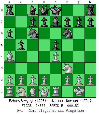 Last move : 0-1 2011 July 29 8:42:21 [Event "FICGS__CHESS__RAPID_B__000182"] [Site "FICGS"] [Date "2011.06.18"] [Round "1"] [White "Ezhov,Sergey"] [Black "Wilson,Norman"] [Result "0-1"] [WhiteElo "1706"] [BlackElo "1721"] 1.e4 e5 2.Nf3 Nc6 3.Bb5 a6 4.Ba4 Nf6 5.O-O Be7 6.Re1 b5 0-1 This chess game has been lost on time (started : 2011.06.18 9:3:1) Ruy Lopez : Closed defense Kingside Castling by player White (move 5) Player Black won this chess game. Follow this game move after move (download)When your house is on fire, you can't be bothered with the neighbors. Or, as we say in Chess, if your King is under attack you don't worry about losing a Pawn on the Queen's side. (Gary Kasparov) Viele Opfer benötigen überhaupt keine konkrete Berechnung. Es genügt sich die entstehende Position kurz vorzustellen, um uns davon zu überzeugen, dass das Opfer korrekt ist. (Mikhail Nekhemyevich Tal) Alguna parte de un error es siempre correcto. (Savielly Tartakover) À la honte des hommes, on sait que les lois du jeu sont les seules qui soient partout justes, claires, inviolables et exécutées. Pourquoi l'Indien qui a donné les règles du jeu d'échecs est-il obéi de bon gré dans toute la terre, et que les décrétales des papes, par exemple, sont aujourd'hui un objet d'horreur et de mépris ? C'est que l'inventeur des échecs combina tout avec justesse pour la satisfaction des joueurs, et que les papes, dans leurs décrétales, n'eurent en vue que leur seul avantage. L'Indien voulut exercer également l'esprit des hommes et leur donner du plaisir; les papes ont voulu abrutir l'esprit des hommes. Voltaire (Dictionnaire philosophique / Garnier 1967) If only people were all showed a certain minimum level of niceness; if only people didn't retract verbal draw offers (without draw box ticked) on ficgs; if only people didn't kill; if only people didn't run concentration / extermination camps, if only people didn't drop nuclear bombs on Hiroshima and Nagasaki, and so on - it would be a much more beautiful world. But sadly, things are not so... (Normajean Yates)