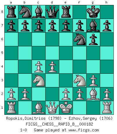 Last move : 1-0 2011 July 29 8:42:21 [Event "FICGS__CHESS__RAPID_B__000182"] [Site "FICGS"] [Date "2011.06.18"] [Round "1"] [White "Ropokis,Dimitrios"] [Black "Ezhov,Sergey"] [Result "1-0"] [WhiteElo "1798"] [BlackElo "1706"] 1.d4 Nf6 2.c4 g6 3.Nc3 Bg7 4.Nf3 O-O 5.g3 Re8 6.Bg2 1-0 This chess game has been lost on time (started : 2011.06.18 9:3:1) King's Indian defense, 3.Nc3 Kingside Castling by player Black (move 4) Player White won this chess game. Follow this game move after move (download)Bobby Fischer is the greatest Chess genius of all time ! (Alexander Kotov) Moralische Siege zählen nicht. (Savielly Grigorievitsch Tartakower) Tu cuerpo tiene que estar en óptima condición. Tu Ajedrez se deteriora como lo hace tu cuerpo. No puedes separar la mente y el cuerpo. (Bobby Fischer) Les Echecs ne sont pas pour les âmes timides. Ils requièrent un homme entier, qui ne s'arrête pas aveuglément à ce qui a été déjà établi, mais qui tente individuellement de sonder les profondeurs du jeu. (W. Steinitz) Games, world of games... There's always an opponent, and there's always a victim. (Revolver, movie)