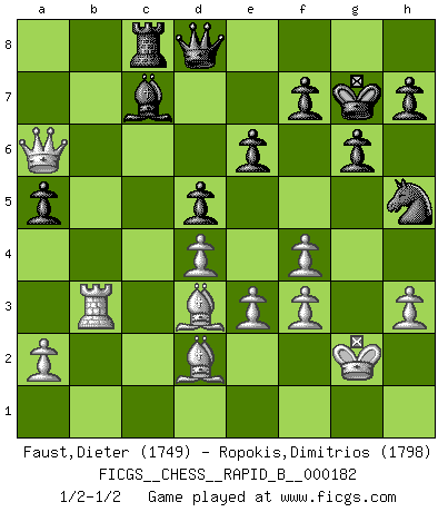 Last move : 1/2-1/2 2011 September 3 19:37:54 [Event "FICGS__CHESS__RAPID_B__000182"] [Site "FICGS"] [Date "2011.06.18"] [Round "1"] [White "Faust,Dieter"] [Black "Ropokis,Dimitrios"] [Result "1/2-1/2"] [WhiteElo "1749"] [BlackElo "1798"] 1.d4 d5 2.c4 c6 3.Nf3 Nf6 4.Nc3 a6 5.c5 b6 6.cxb6 Qxb6 7.e3 Bg4 8.Qb3 Qc7 9.Be2 Nbd7 10.h3 Bh5 11.Bd2 e6 12.Rc1 Be7 13.O-O O-O 14.Qc2 Rfb8 15.Na4 Ne4 16.Be1 Rc8 17.Bd3 Bxf3 18.gxf3 Nef6 19.f4 g6 20.b4 Qa7 21.Kg2 Nh5 22.Rg1 Bd8 23.Nc5 Nxc5 24.Qxc5 Bb6 25.Qc2 Qe7 26.Qa4 Qc7 27.Bd2 Nf6 28.Rc2 a5 29.b5 cxb5 30.Qxb5 Qd8 31.Rxc8 Rxc8 32.Rb1 Bc7 33.Qa6 Kg7 34.f3 Nh5 35.Rb3 Ra8 36.Qc6 Rc8 37.Qa6 1/2-1/2 QGD Slav : 4.Nc3 Kingside Castling by player White (move 13) Kingside Castling by player Black (move 13) This chess game ended in a draw. Follow this game move after move (download)I am still a victim of Chess. It has all the beauty of art and much more. It cannot be commercialized. Chess is much purer than art in its social position. (Marcel Duchamp) Ich glaube, ich kenne inzwischen die Gründe für mein Versagen: schachliche Charakterfehler. Ich war nie ein Wunderkind und in meiner gesamten menschlichen Entwicklung immer zu langsam. (Viktor Kortschnoi) Fischer sacrificó virtualmente todo lo que la mayoría de nosotros los 'debiles' (término que él usa) valoramos, respetamos y apreciamos por el amor de un astuto, a menudo hermoso tablero de juego, por el privilegio ambivalente de ser su mas grande maestro. (Paul Kollar) Fischer est le meilleur joueur du monde et Karpov n'est qu'un joueur de bistrot. (Garry Kasparov, agé de 16 ans) You lose, general Kenobi. (General Grievous in Star Wars ep.3)