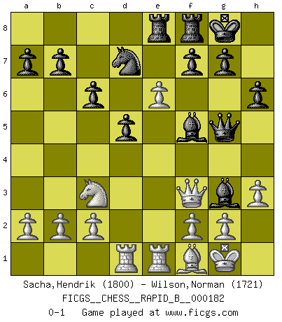 Last move : 0-1 2011 August 20 9:51:49 [Event "FICGS__CHESS__RAPID_B__000182"] [Site "FICGS"] [Date "2011.06.18"] [Round "1"] [White "Sacha,Hendrik"] [Black "Wilson,Norman"] [Result "0-1"] [WhiteElo "1800"] [BlackElo "1721"] 1.e4 e6 2.Nf3 d5 3.exd5 exd5 4.d4 Nf6 5.Bb5+ c6 6.Bd3 Bd6 7.O-O O-O 8.Re1 h6 9.Nc3 Be6 10.Ne5 Nbd7 11.Bf4 Bc7 12.Qf3 Nxe5 13.dxe5 Nd7 14.h3 Qh4 15.Rad1 Rae8 16.Bf1 Bf5 17.Bg3 Qg5 18.e6 Bxg3 0-1 This chess game has been lost on time (started : 2011.06.18 9:3:1) French defense Kingside Castling by player White (move 7) Kingside Castling by player Black (move 7) Player Black won this chess game. Follow this game move after move (download)Morphy was probably the greatest genius of them all. (Bobby Fischer) Wie gewinnt Tal? Er entwickelt alle seine Figuren in die Brettmitte und opfert sie dann irgendwo. (Robert James Fischer) Un sacrificio se refuta mucho mejor al aceptarlo. (Wilhelm Steinitz) La vie est comme un jeu d'échecs : nous esquissons un plan, mais celui-ci est tributaire de ce que daignent faire l'adversaire aux échecs et le destin dans la vie. (Arthur Schopenhauer) All battles are fought by scared men who'd rather be someplace else. (John Wayne in the movie In harm's way)