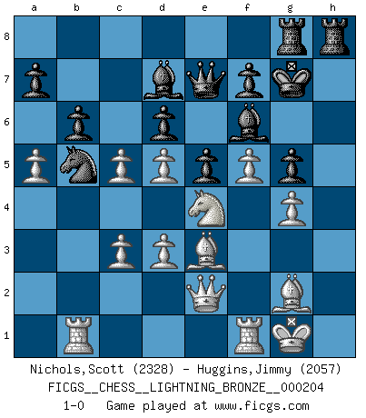 Last move : 1-0 2011 June 18 23:37:24 [Event "FICGS__CHESS__LIGHTNING_BRONZE__000204"] [Site "FICGS"] [Date "2011.06.18"] [Round "1"] [White "Nichols,Scott"] [Black "Huggins,Jimmy"] [Result "1-0"] [WhiteElo "2328"] [BlackElo "2057"] 1.e4 c5 2.g3 Nc6 3.Nc3 g6 4.Bg2 Bg7 5.h3 Nf6 6.f4 e5 7.Nge2 d6 8.d3 Nd4 9.a4 Bd7 10.O-O O-O 11.g4 Rc8 12.f5 h6 13.Ng3 Qb6 14.a5 Qd8 15.Be3 Rb8 16.Nd5 Nxd5 17.exd5 Qh4 18.Bf2 Qe7 19.c3 Nb5 20.Be3 Kh7 21.Qf3 Bf6 22.Ne4 g5 23.h4 Rh8 24.hxg5 hxg5 25.Qe2 Rbg8 26.Rab1 Kg7 27.b4 b6 28.bxc5 1-0 Sicilian : Steinitz variation Kingside Castling by player White (move 10) Kingside Castling by player Black (move 10) Player White won this chess game. Follow this game move after move (download)It is peculiar but a fact nevertheless, that gamblers in chess always have enthusiastic followers. (Botvinnik) Es ist nicht das erste mal, dass sich die FIDE dem Arabischen Geld gebeugt hat (über die FIDE WM 2004 in Lybien). (Larry Evans) El Ajedrez es un terrible juego. Si no controlas el centro, tu oponente tiene una posición mas holgada. Si tienes control del centro, ¡entonces realmente tu tienes algo de que preocuparte!. (Siegbert Tarrasch) RxDa4 pat (...) There are two types of people in this world, good and bad. The good sleep better, but the bad seem to enjoy the waking hours much more. (Woody Allen)